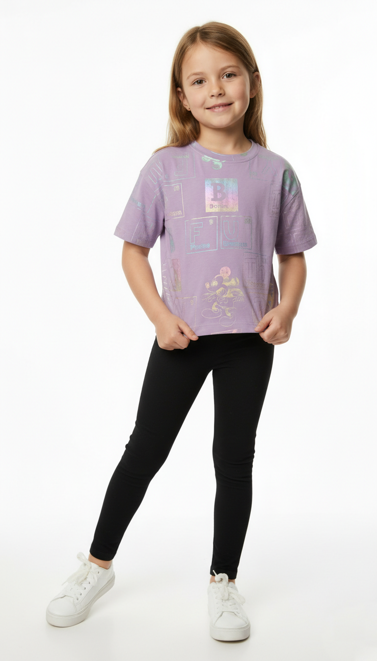 Step into the magic with our Disney Mickey Mouse Iridescent Graphic Tee! ✨🐭 This awesome black t-shirt is a must-have for any young Disney fan. It showcases a striking all-over iridescent metallic print featuring element-like boxes with playful names and the iconic silhouette of Mickey Mouse. The colors shift and shimmer, making this tee a captivating and stylish choice. Crafted from a soft and comfortable material, it's perfect for everyday adventures, bringing a touch of Disney charm and cool graphics to their wardrobe.