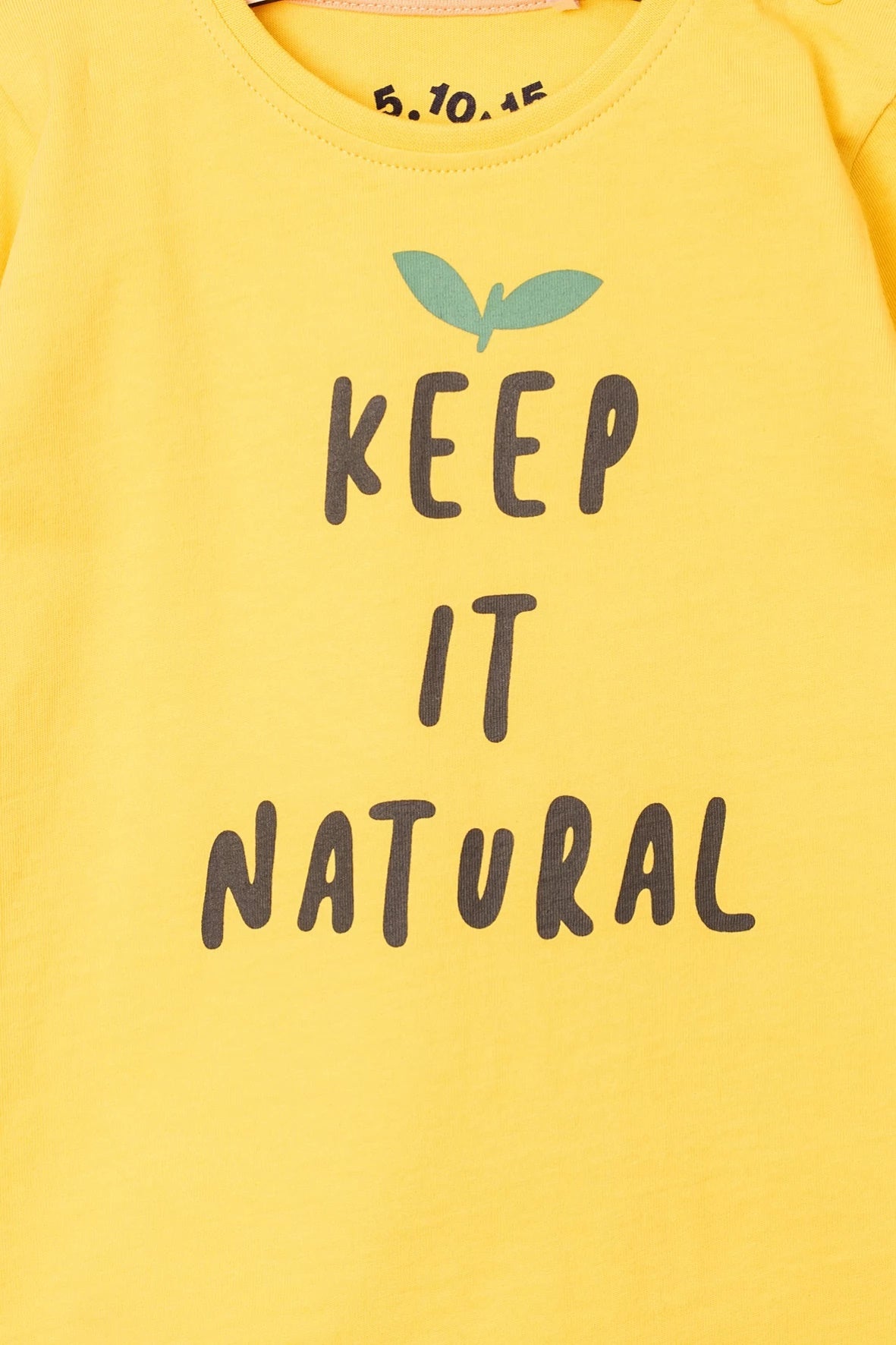 The long-sleeved blouse owes its originality to a beautiful, warm yellow color. The energetic color will wonderfully emphasize the child's beauty and will be perfect especially for accessories in subdued colors. A durable, soft print appears in the central part. It shows a large, dark-colored inscription with a positive message, complemented by green leaves that contrast with the background. Inside the small neckline there is a pink trim. On one of the arms there are practical, small press studs that make it easier to put on clothes. The loose, standard cut guarantees high comfort while wearing, therefore it will be perfect as an element of an outfit for active days.