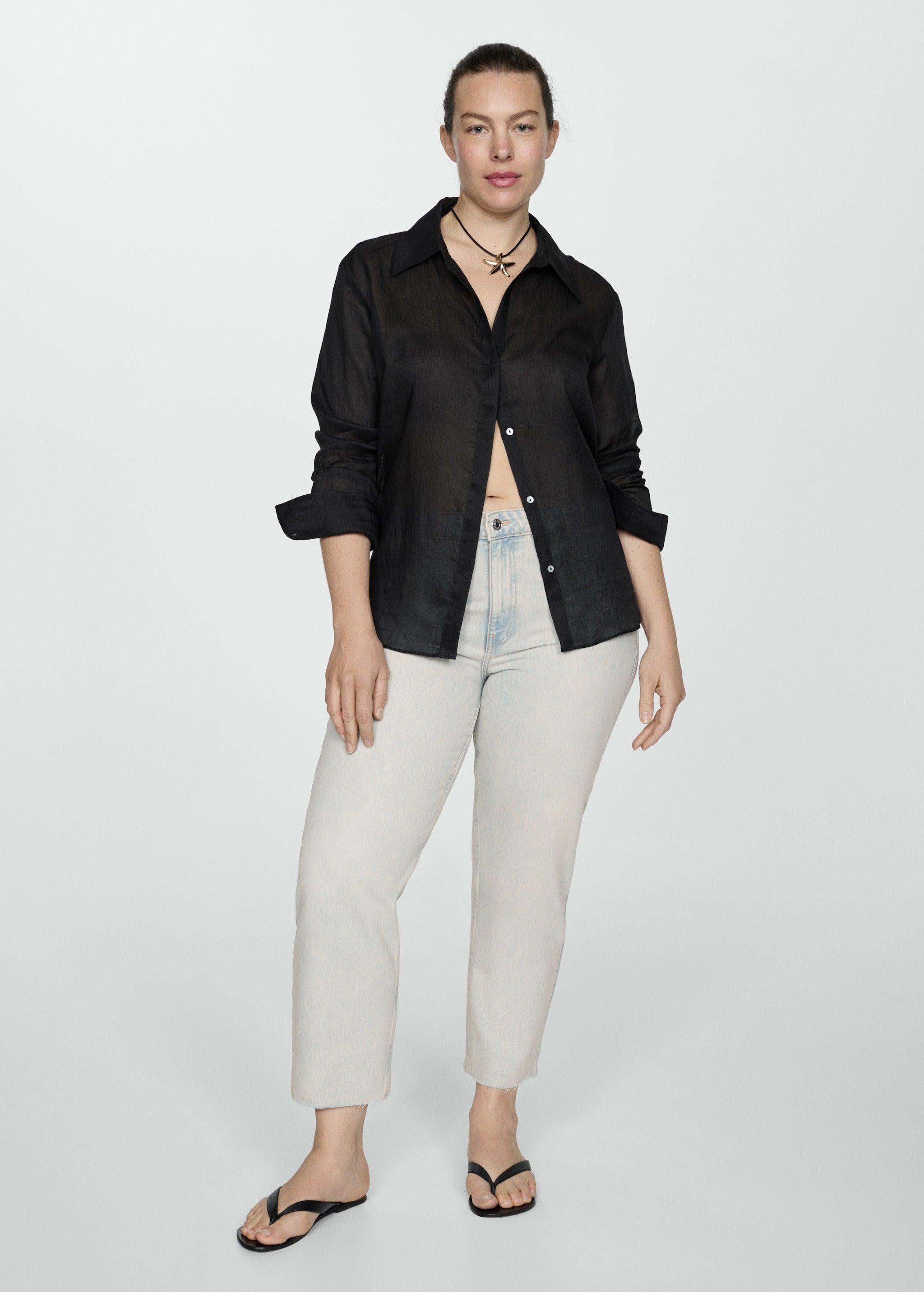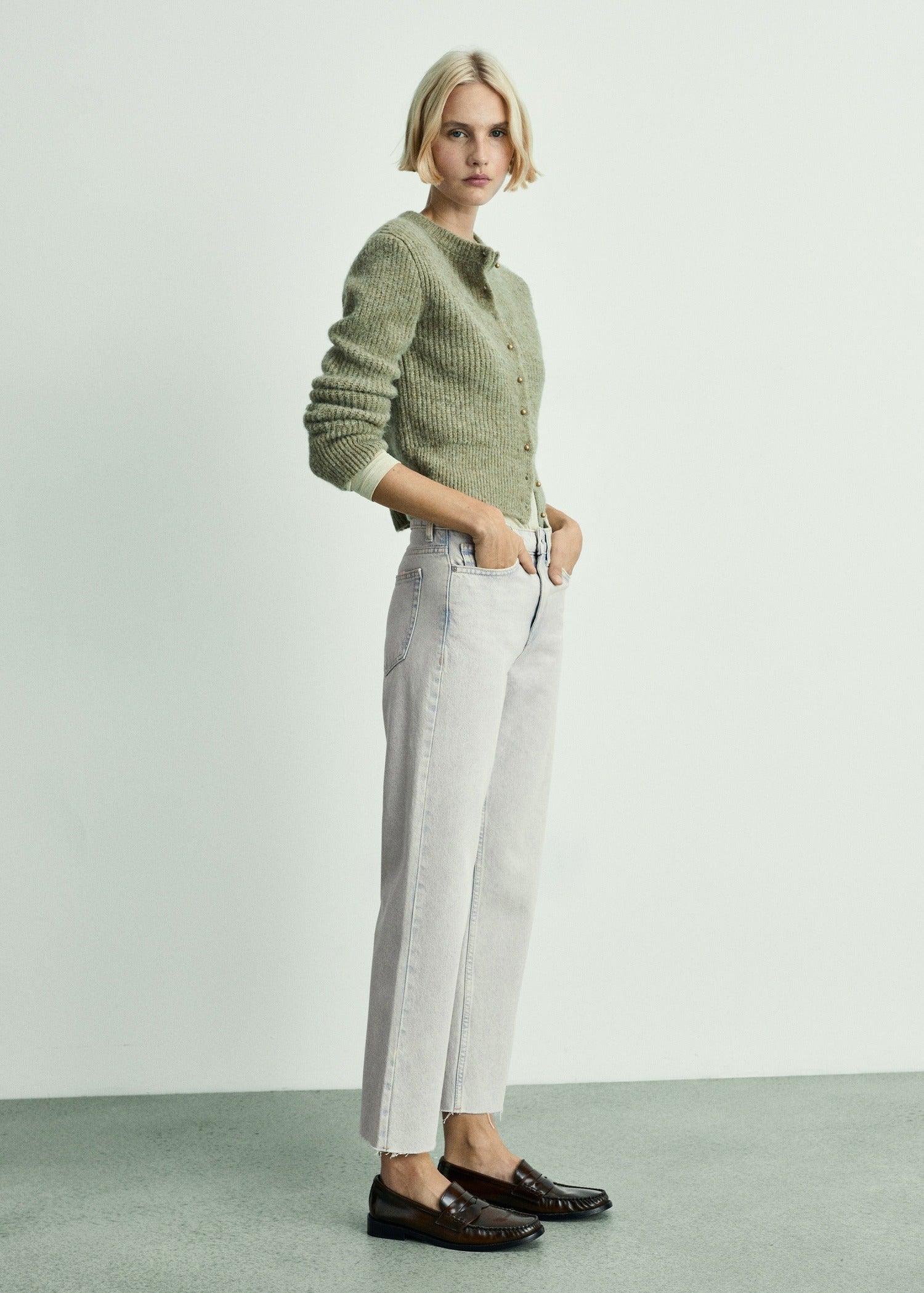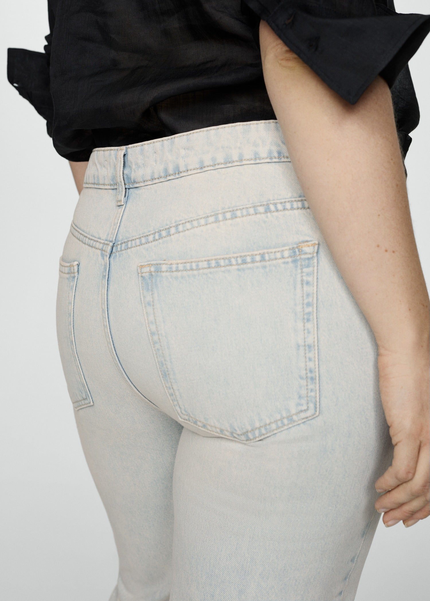 Denim style cotton fabric. Straight Design. Cropped design. Medium waist. Loops. Five pockets. Zip and one button fastening. Frayed hem. Inseam 68 cm. Available Plus. The model is 1.79 tall and is wearing a size 36.