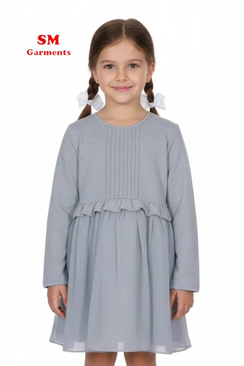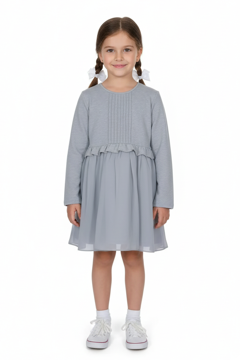 Chic, comfy, and effortlessly elegant — the Bowtad Grey Long Sleeve Dress is a must-have for any stylish young girl's wardrobe. Featuring a soft, sweatshirt-style top with pintuck details and a gently gathered ruffle waist, this dress flows into a light, airy chiffon-like skirt. Ideal for cooler seasons or dressy casual occasions.