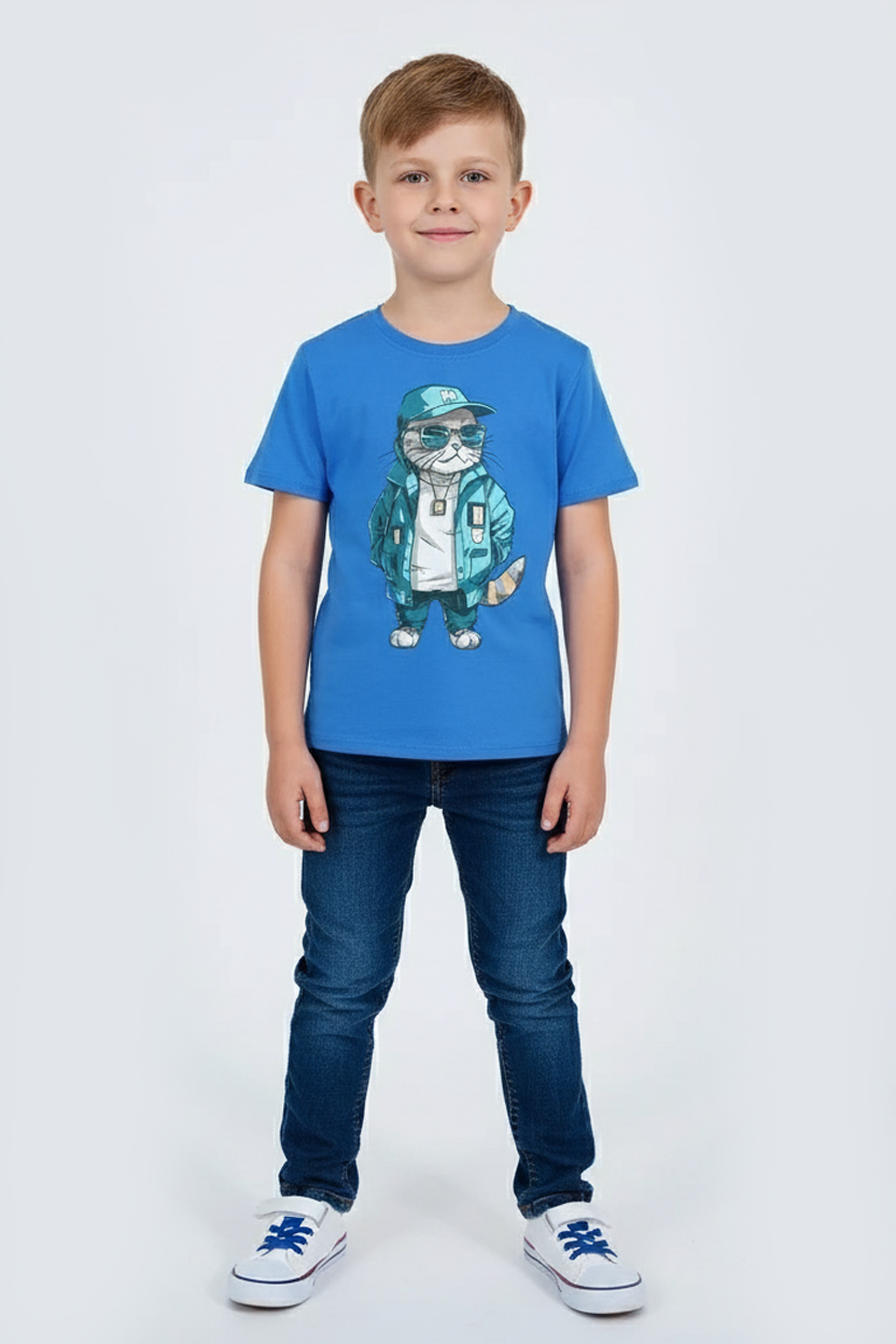 Let your little one show off some serious street style with the Cool Cat Graphic Tee! Featuring a funky, cartoon cat decked out in shades, sneakers, and a cap, this playful blue t-shirt is a fun and comfy essential for kids who love character and charm in their wardrobe.