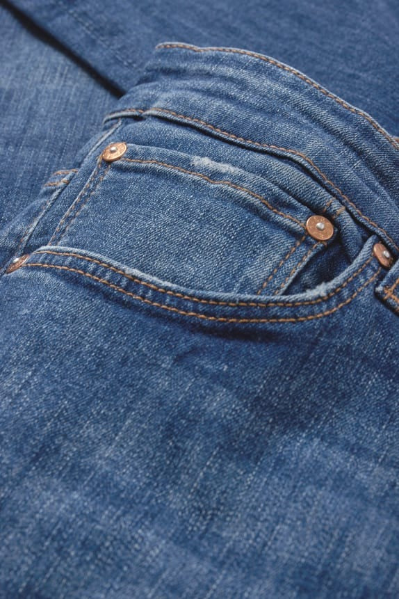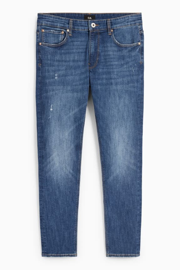 Skinny fit jeans in stretch denim. Whiskering plus garment-washed and distressed effects.