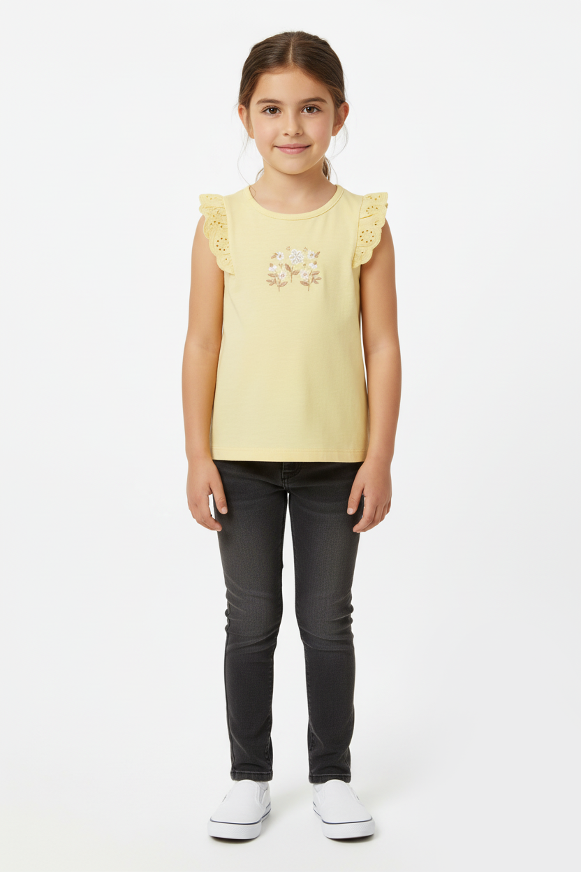 Newborn outfit in fine fabric. Top in soft jersey with broderie anglaise trims, appliquéd motif and press studs on the back.