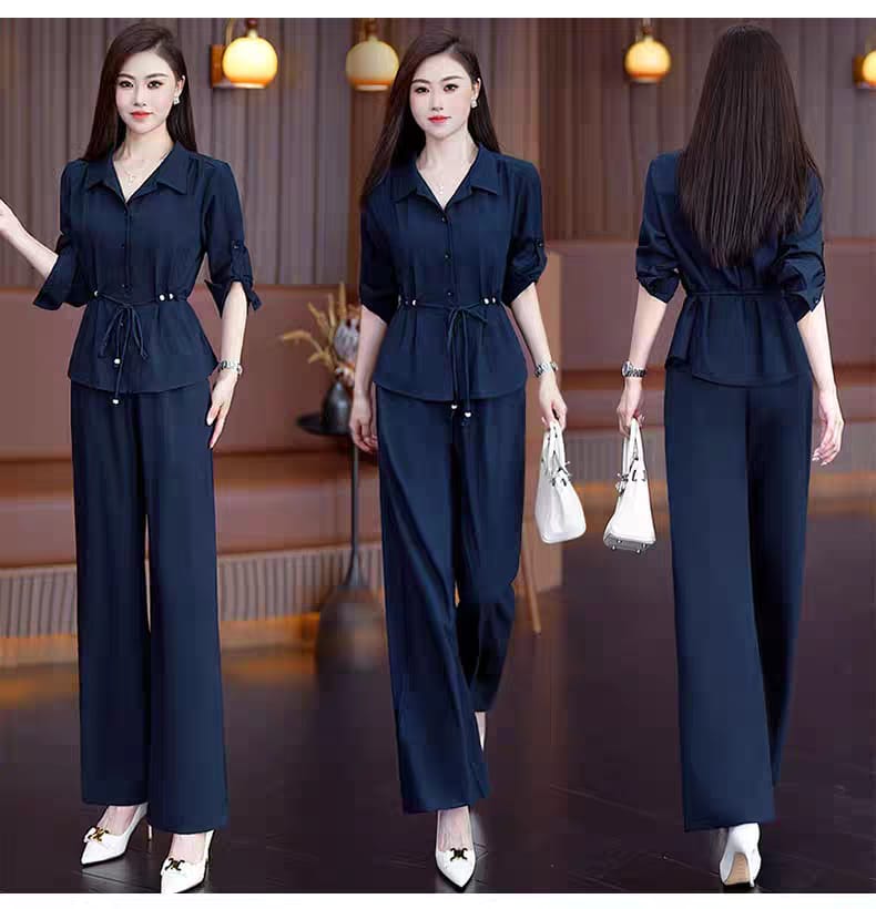 This sophisticated navy blue pant suit is a versatile and timeless addition to any modern woman's wardrobe, perfect for transitioning from the office to an evening out. The ensemble features a short-sleeved, collared blouse with a delicate self-tie belt to define the waist, paired with chic, flowing wide-leg trousers.