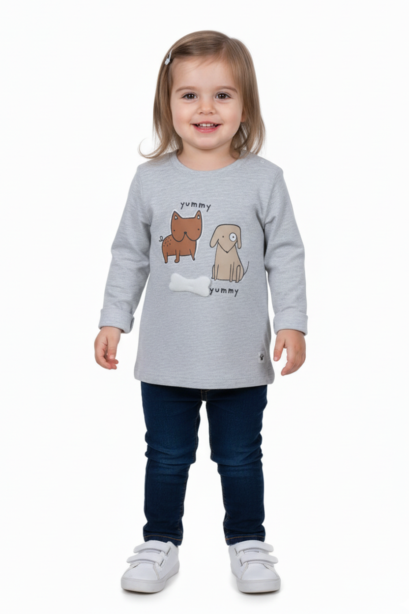 Add a dose of cuteness to your little one’s wardrobe with this soft grey long sleeve t-shirt from Fox & Bunny. Featuring two playful cartoon dogs and a fun 3D plush bone detail, this tee is perfect for everyday comfort with a hint of whimsy.