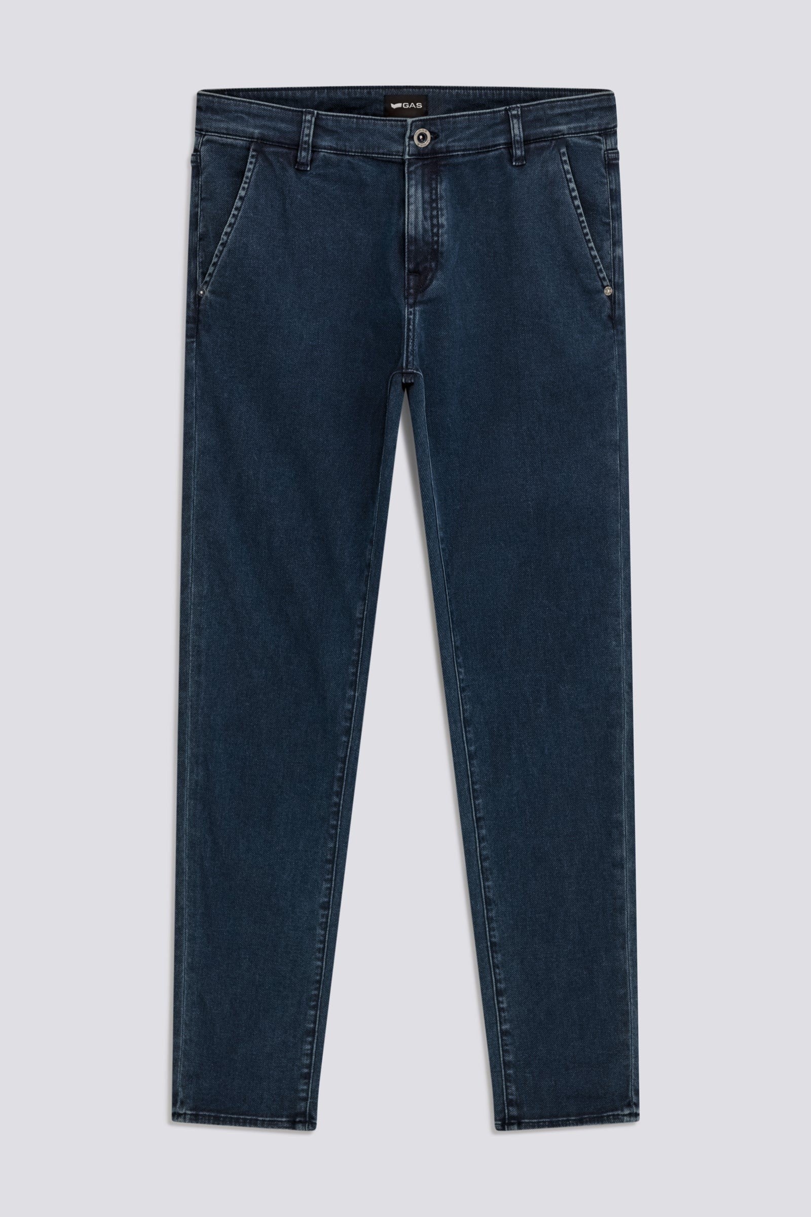 Clean lines and urban spirit for these skinny fit chino denim pants in 10 OZ blue black stretch twill fabric. The medium wash with pumice maintains its deep intensity, highlighting the fabric's texture and minimal details. An essential piece that balances comfort and metropolitan casual style.