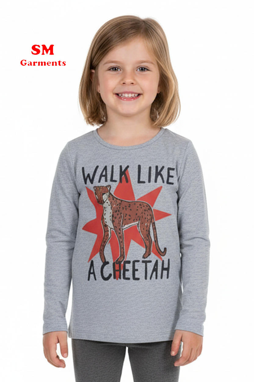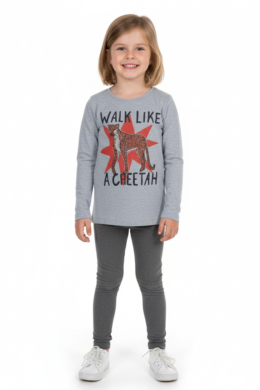 Let your child stride with confidence in this fierce and fun “Walk Like a Cheetah” Graphic Tee. Designed for bold young girls, this heather grey long sleeve top features a playful illustration of a cheetah against a red starburst with empowering typography. Soft, stretchy, and stylish — perfect for school days, playdates, or weekend wear.