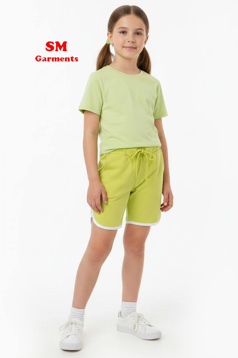 Sports shorts for children in French terry. The garment is in a solid bright green color and has a white finish in the lower part. Model with pockets. Elastic waist with adjustable laces. Soft and comfortable fit perfect for everyday activities. Accessories not for sale. The package contains only the item of clothing.