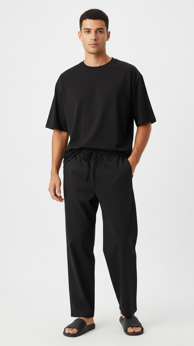 These versatile men's black trousers are perfect for a comfortable yet stylish look. Featuring a modern, relaxed fit and a functional drawstring waist, they offer ease of wear for various occasions. The classic black color makes them easy to pair with almost any top, while the chino-style fabric provides a smart-casual aesthetic. Ideal for everyday wear, running errands, or a relaxed evening out.