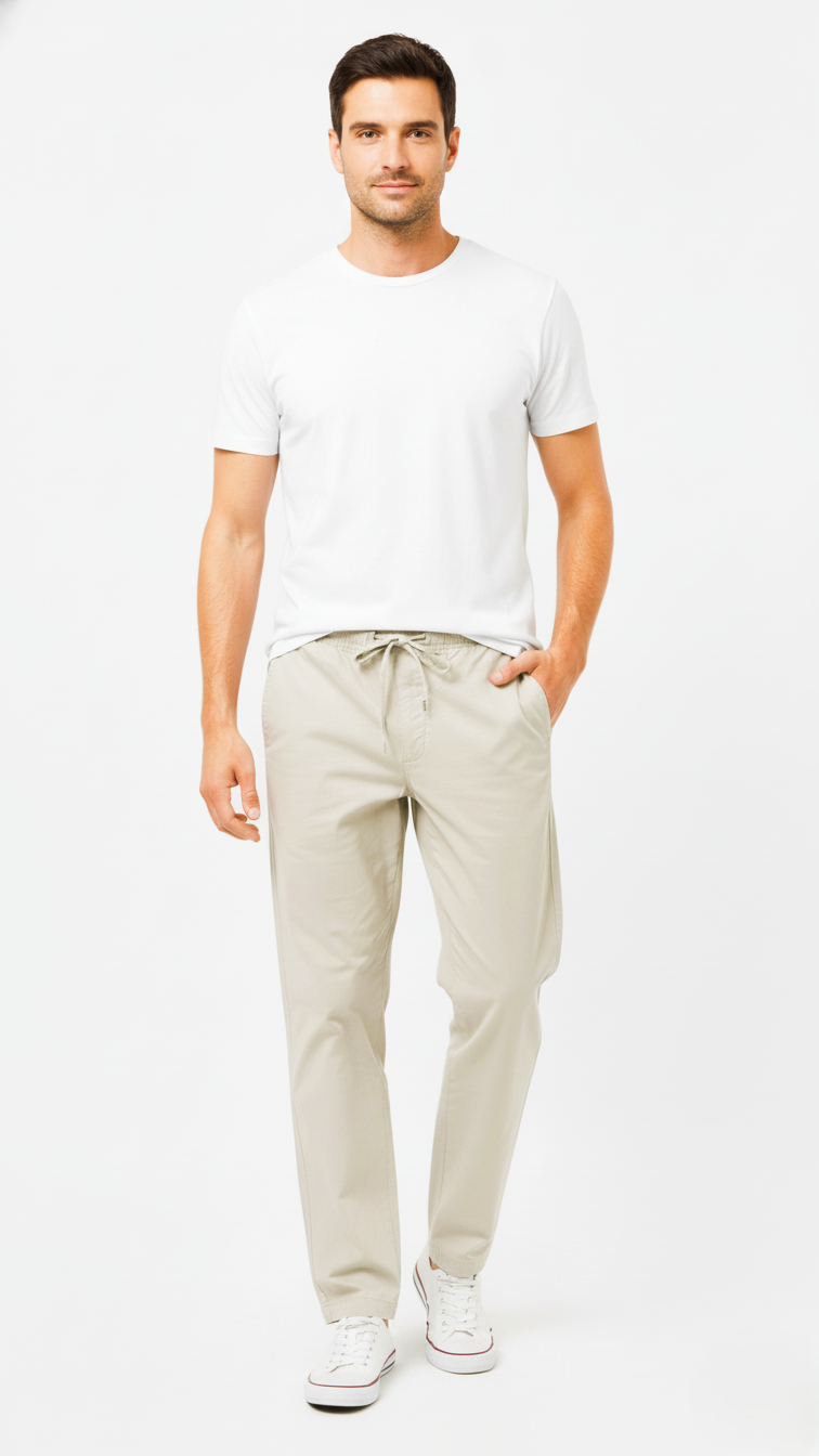 These comfortable and stylish men's trousers feature a relaxed fit and an adjustable drawstring waist, offering both ease of wear and a modern aesthetic. Made from a breathable, light-colored fabric, they are perfect for casual outings or warm weather. The classic design is complemented by practical pockets and a clean finish, making them a versatile addition to any wardrobe. They are paired here with a simple white t-shirt and canvas sneakers for a laid-back look.