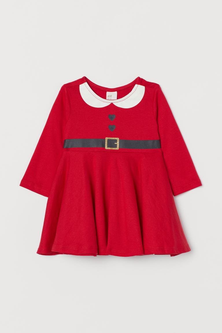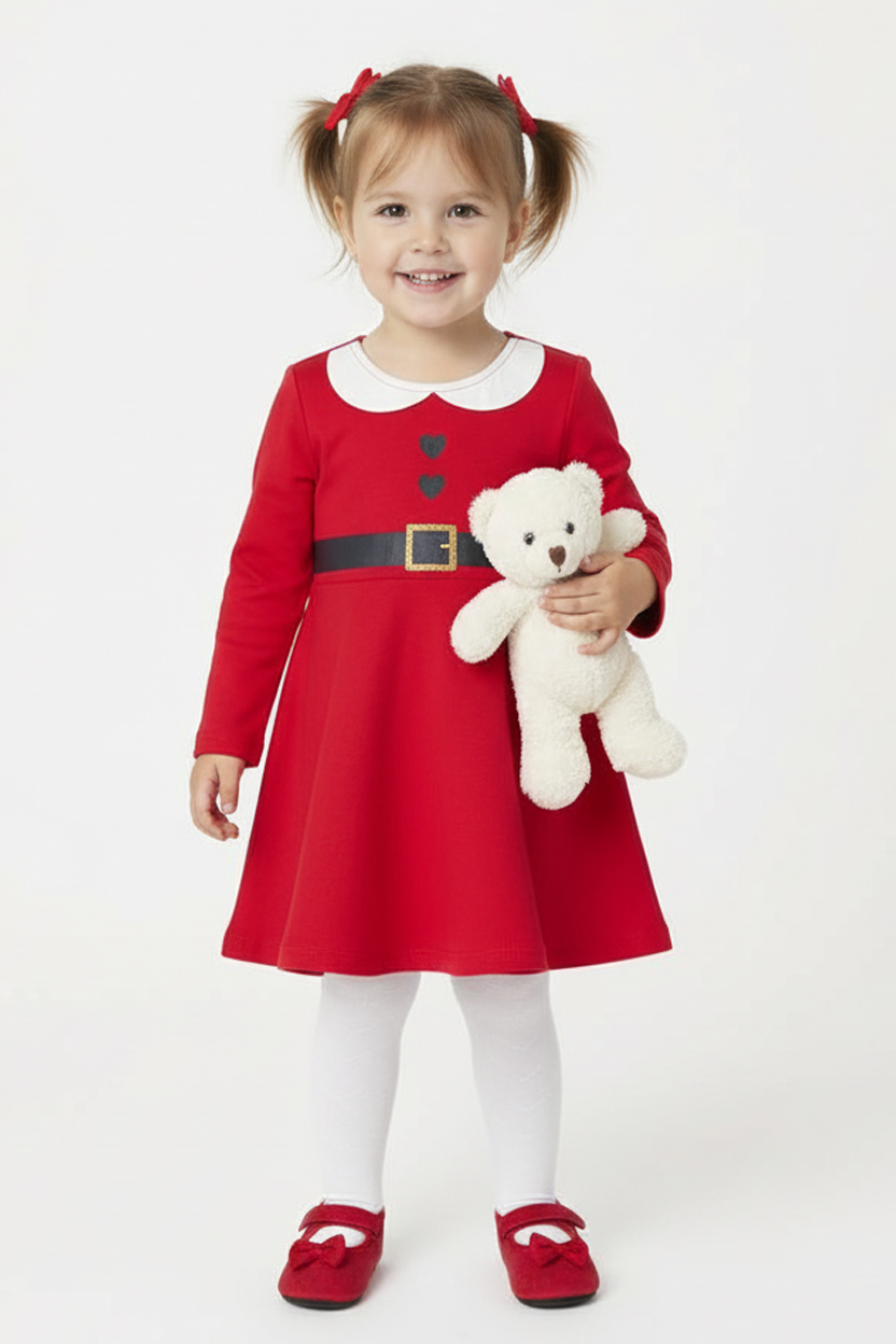Soft cotton plain weave dress with glitter pattern printed on the front, round neck, long sleeve style, stitching at the waist, and umbrella-shaped skirt.