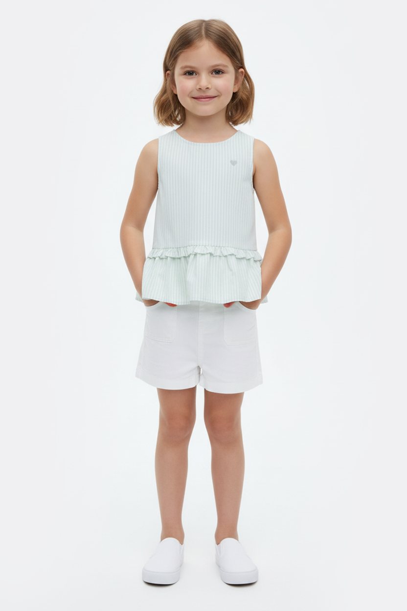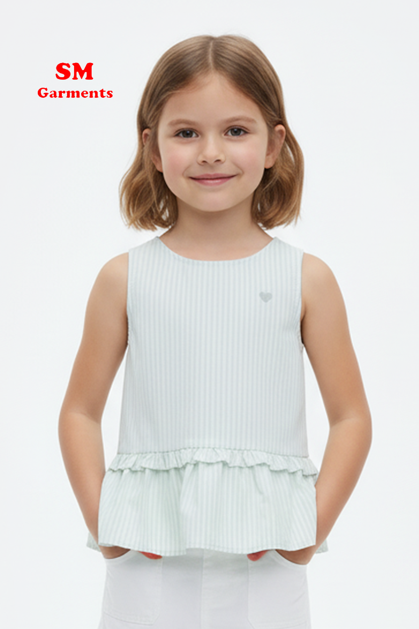 Flared vest tops in soft cotton jersey with narrow elastication and a gathered frill around the neckline and armholes.