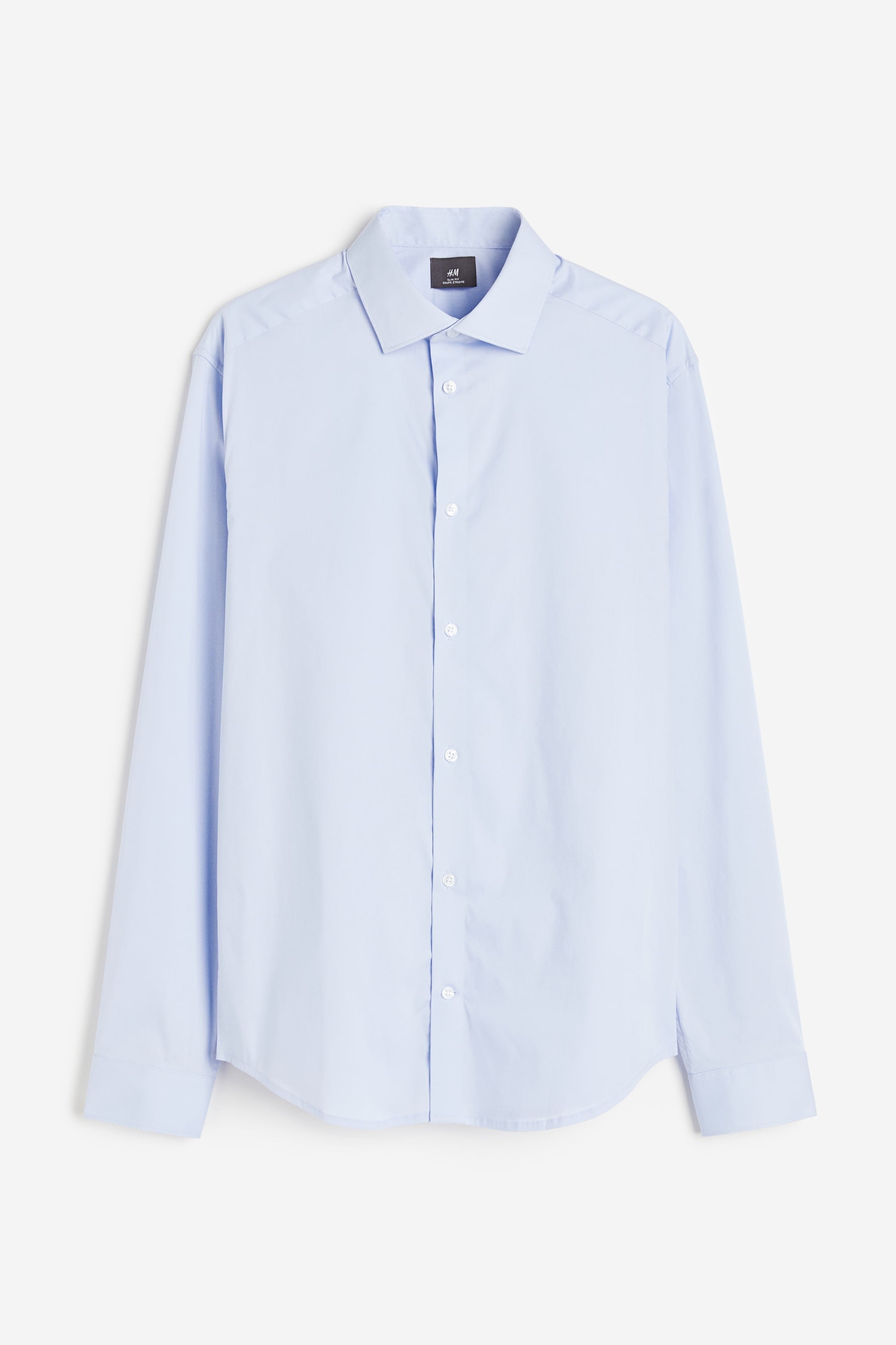 Slim-fit shirt in a stretchy, woven cotton blend with a fitted silhouette. Cut-away collar, classic button placket, and yoke at back. Long sleeves, sleeve placket with link button, and adjustable cuffs with buttons. Gently rounded hem.