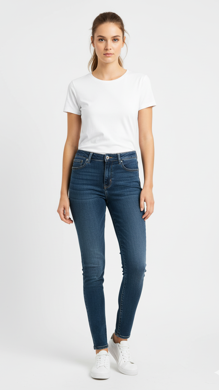 These are a pair of classic dark wash skinny jeans for women. They feature a traditional five-pocket design with subtle whiskering on the thighs, suggesting a slightly worn-in look. The button and zipper closure are visible at the front. The overall style is versatile and timeless, making them suitable for various casual outfits.