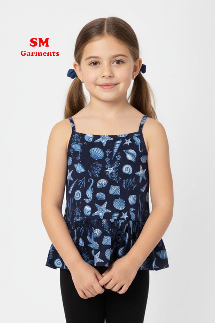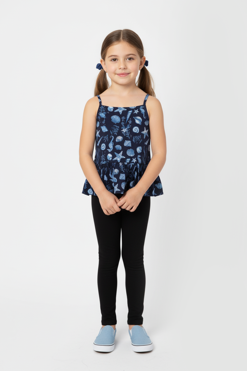 Top with narrow, adjustable shoulder straps and a flared peplum.