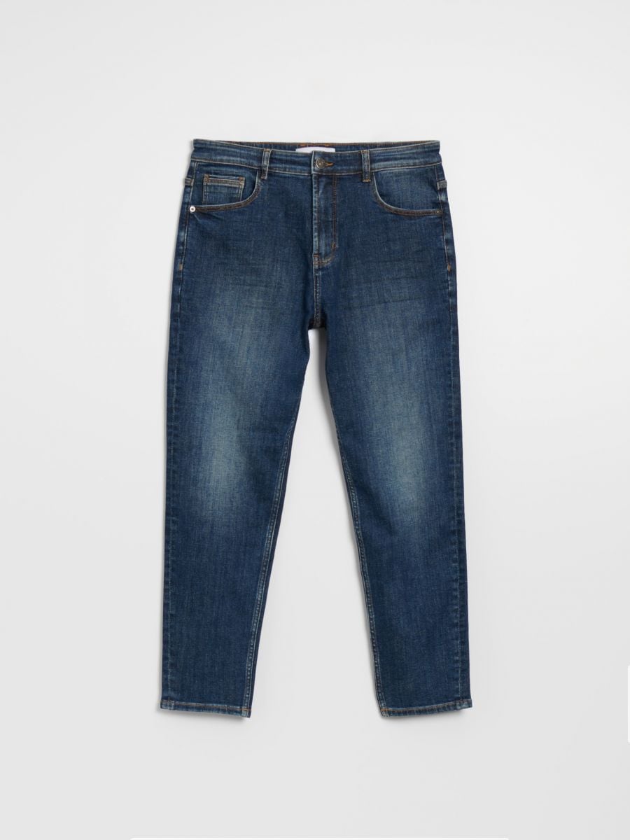 These navy blue jeans feature a zipper and button closure, a five-pocket design, and belt loops. They feature distressed details on the legs that shape the silhouette and add a touch of style. They're made of 100% cotton.