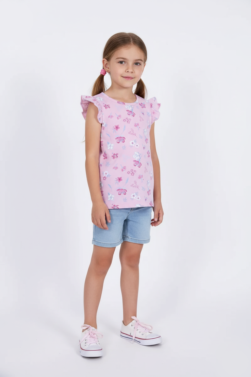Add a splash of charm to your little one’s wardrobe with this adorable pink floral ruffle sleeve top. Designed with delicate flower prints in shades of pink, white, and blue, this sleeveless top is perfect for warm sunny days. The ruffled shoulder details give it a playful and girly touch, making it ideal for casual outings, playdates, or family gatherings.