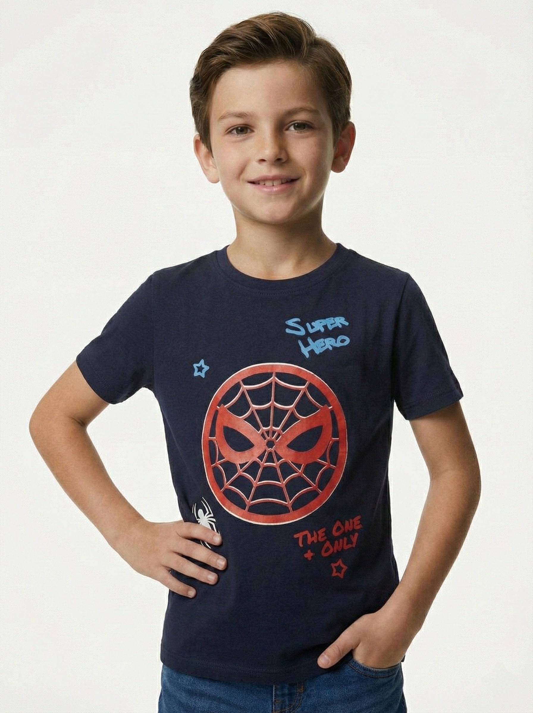 Let your little hero stand out in style with this Boys Navy Blue Superhero Graphic T-Shirt. Designed with a bold red spider web emblem and eye-catching “Super Hero” typography, this tee brings adventure-inspired fashion to everyday wear.