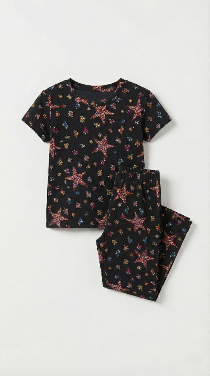 Let your little one shine bright in this adorable and comfortable two-piece set! This charming outfit features a soft, black short-sleeve top and matching wide-leg pants, both adorned with a playful and colorful star print. The vibrant stars add a touch of whimsy and fun to the classic black base, making it perfect for everyday wear, playdates, or even a cozy night in.