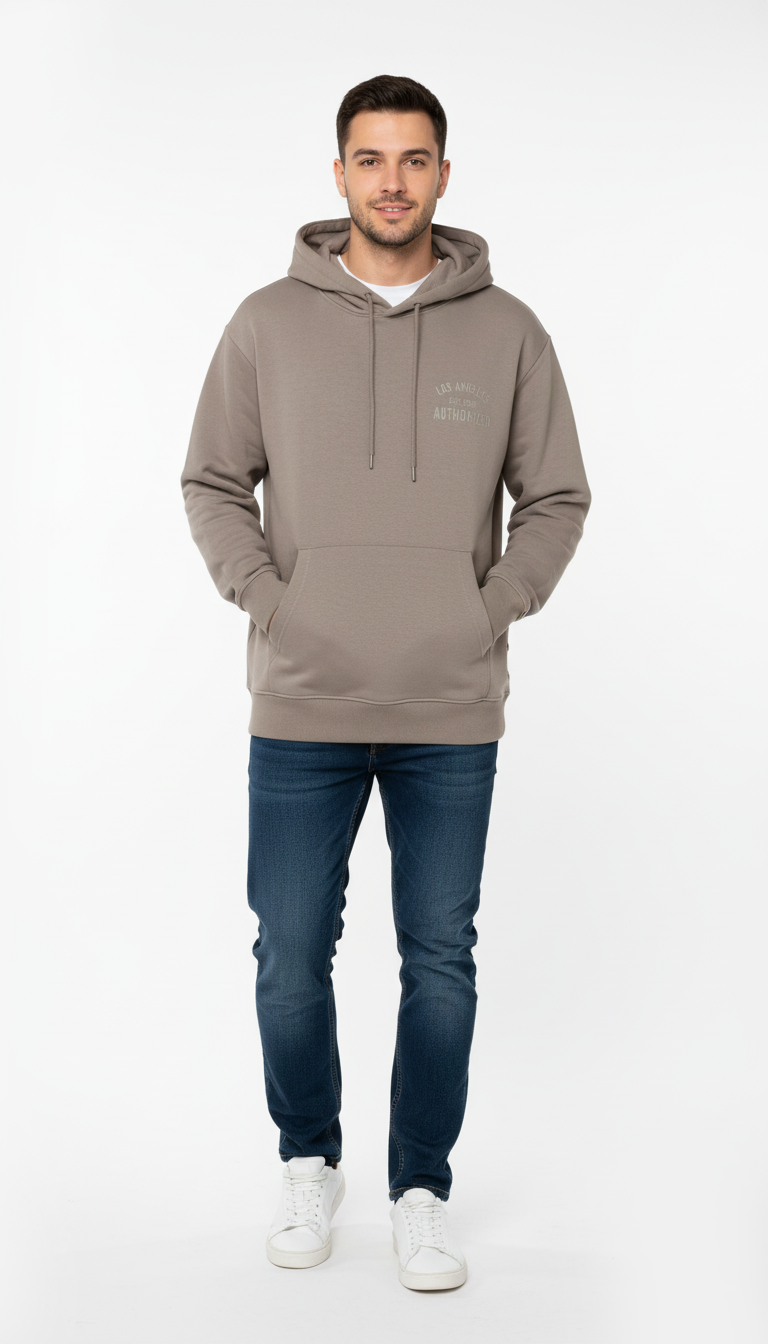 Long-sleeved sweatshirt with a hood and a kangaroo pocket on the front. It has ribbed cuffs and hem. It has small prints on the chest. It has a slightly loose fit and is made of plush fabric.