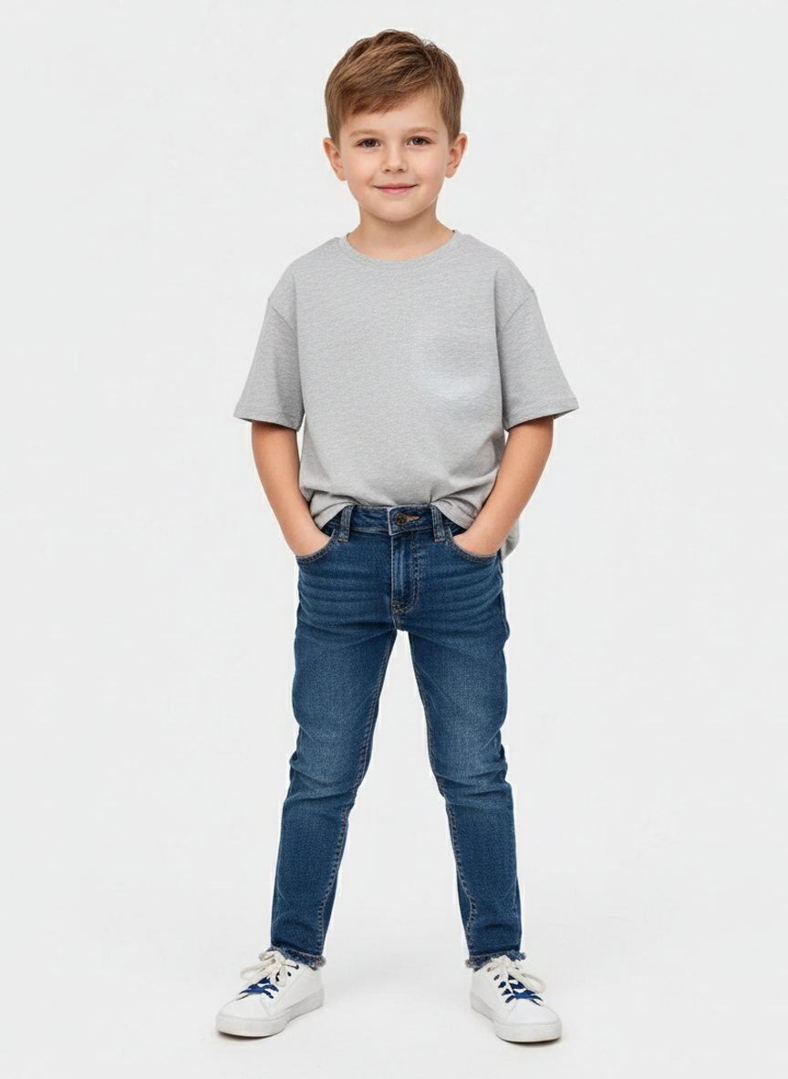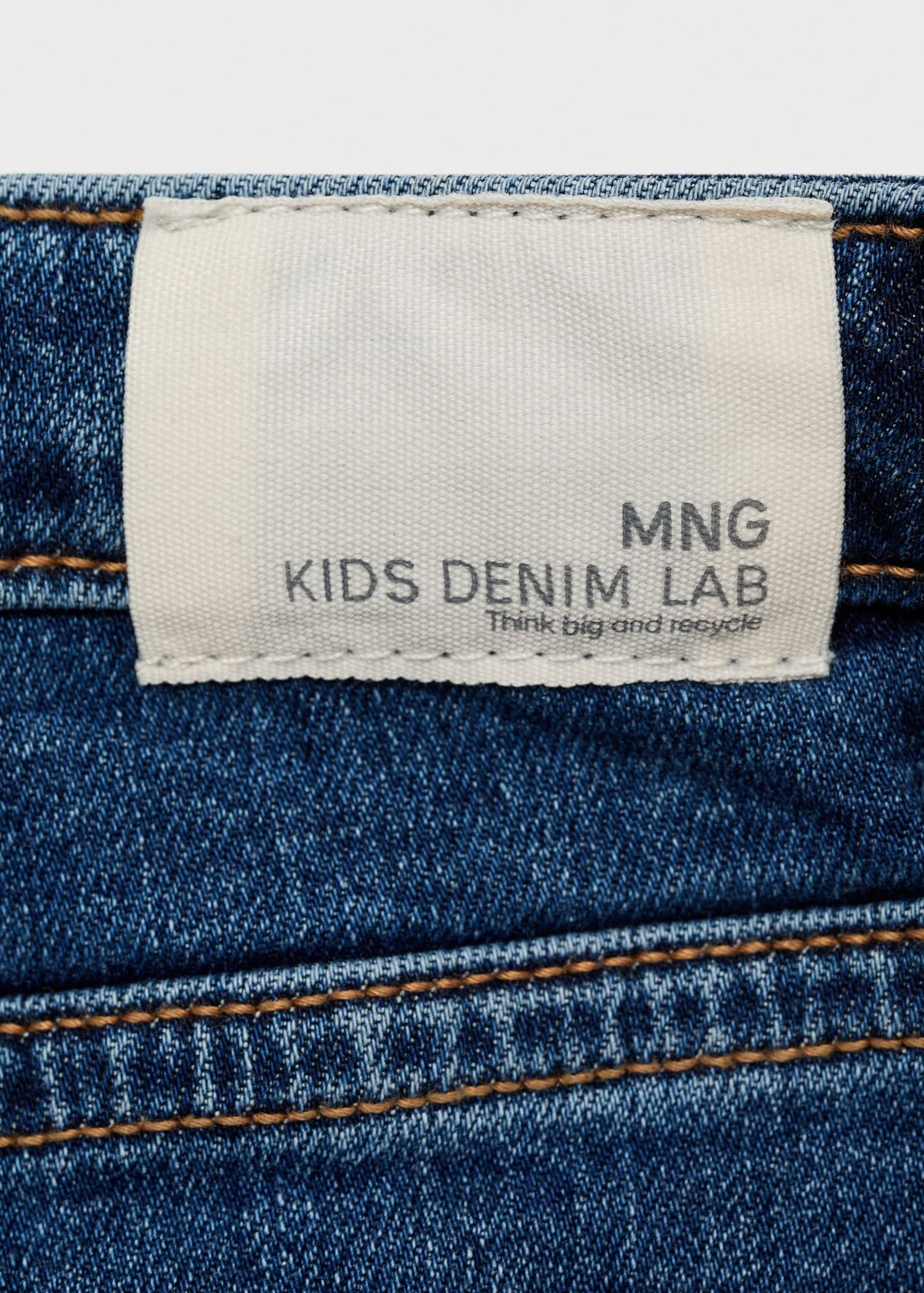 Denim-style cotton fabric. Mid-rise. Five pockets. Zip and button fastening. Hem at the bottom.