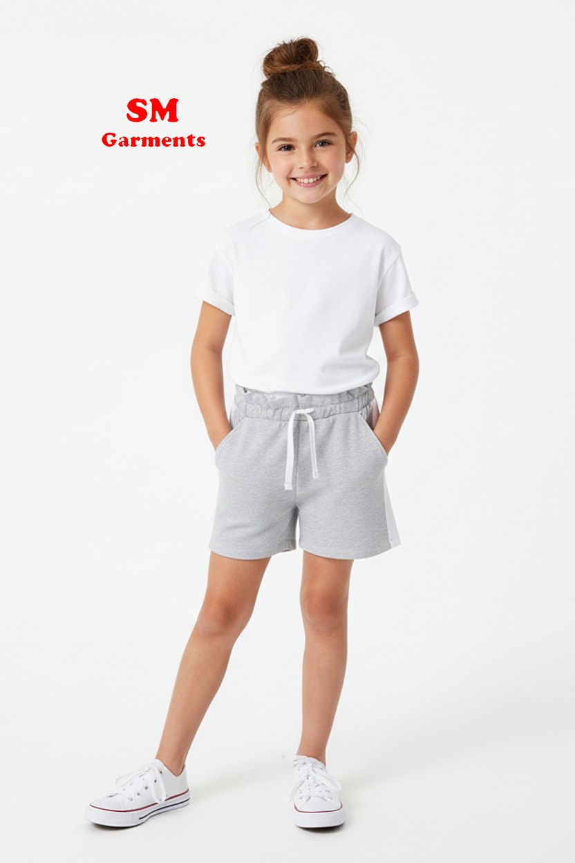 Straight design. Short design. Side contrast panels. Elastic waist with drawstring. Two side pockets.