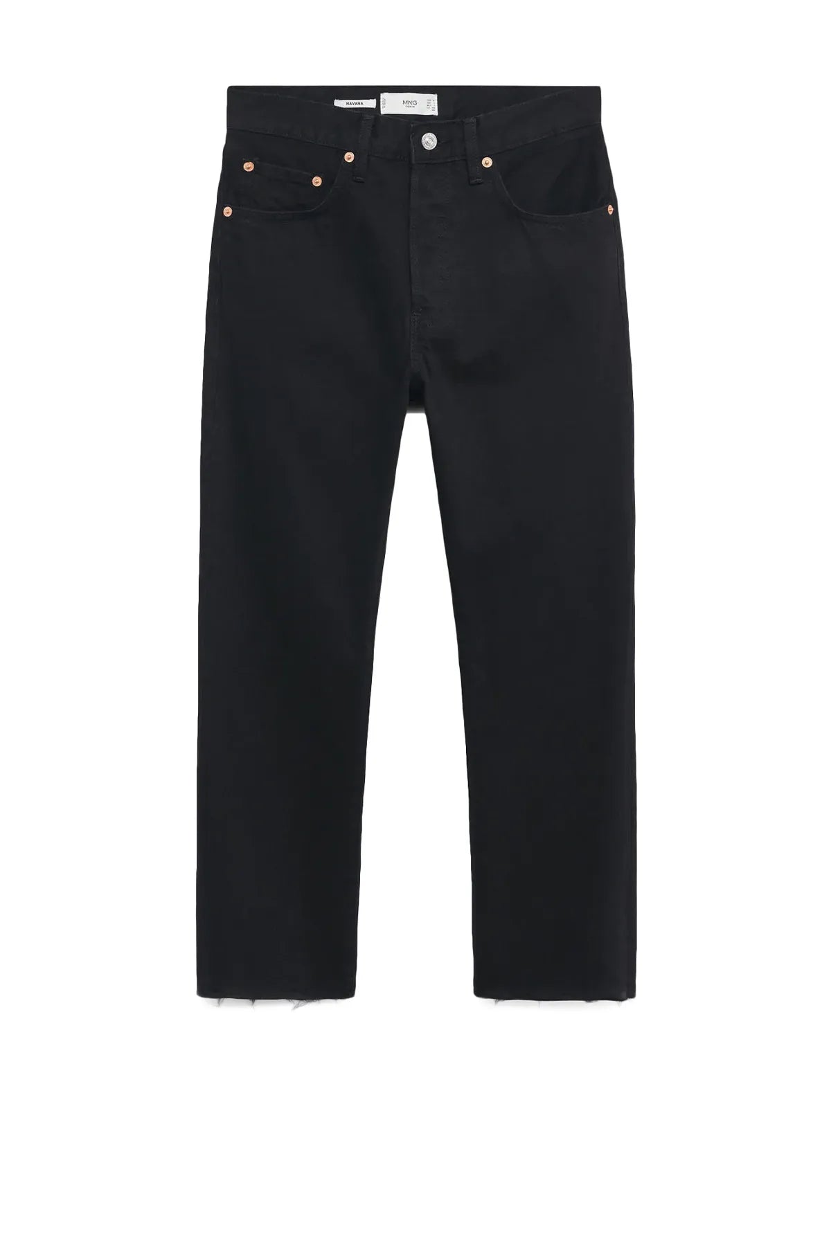 Straight cut. Mid waist. Loops. Five pockets. Frayed hem.