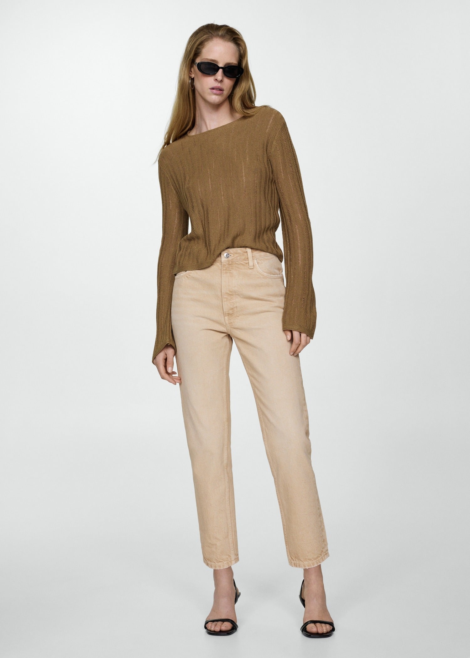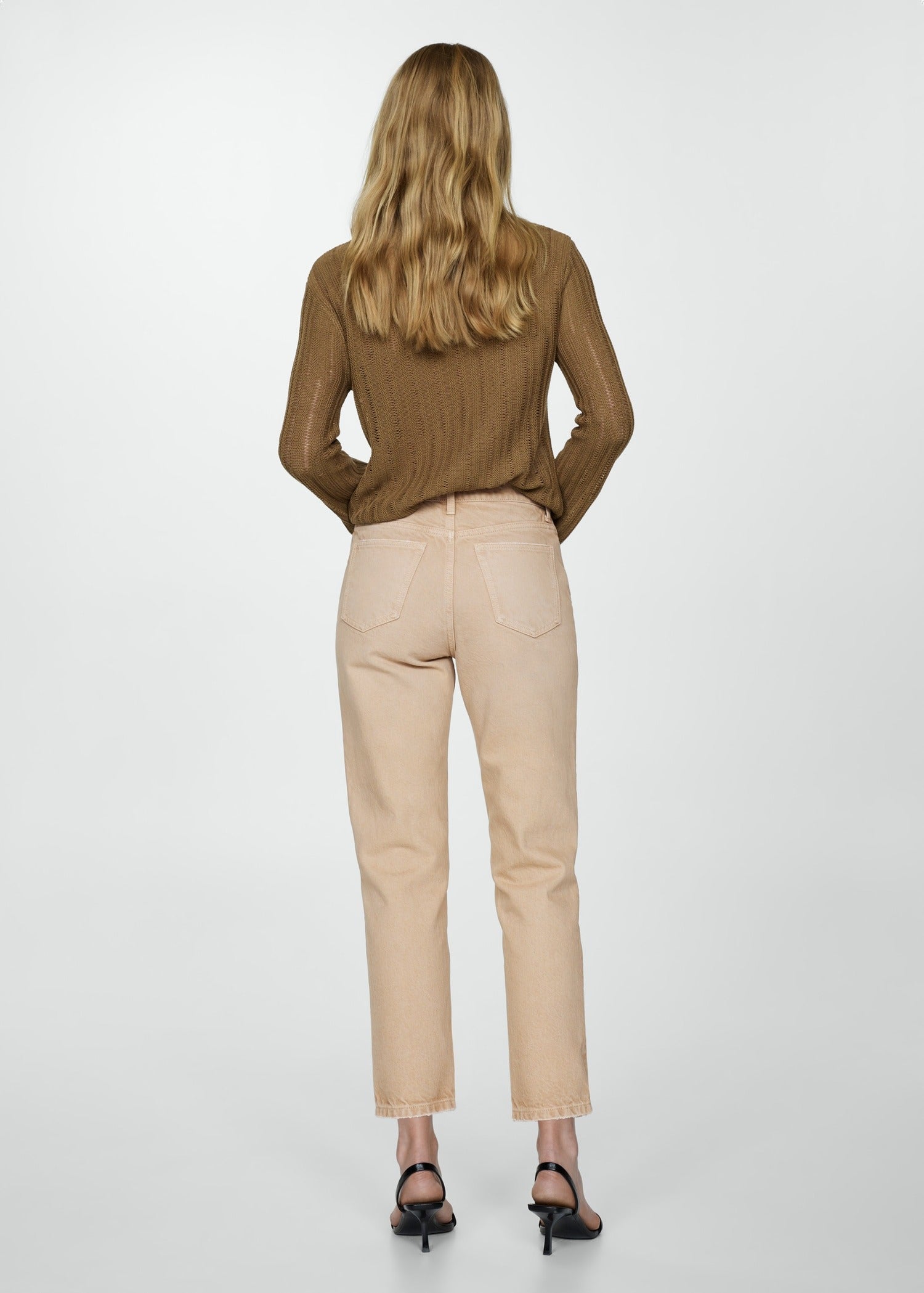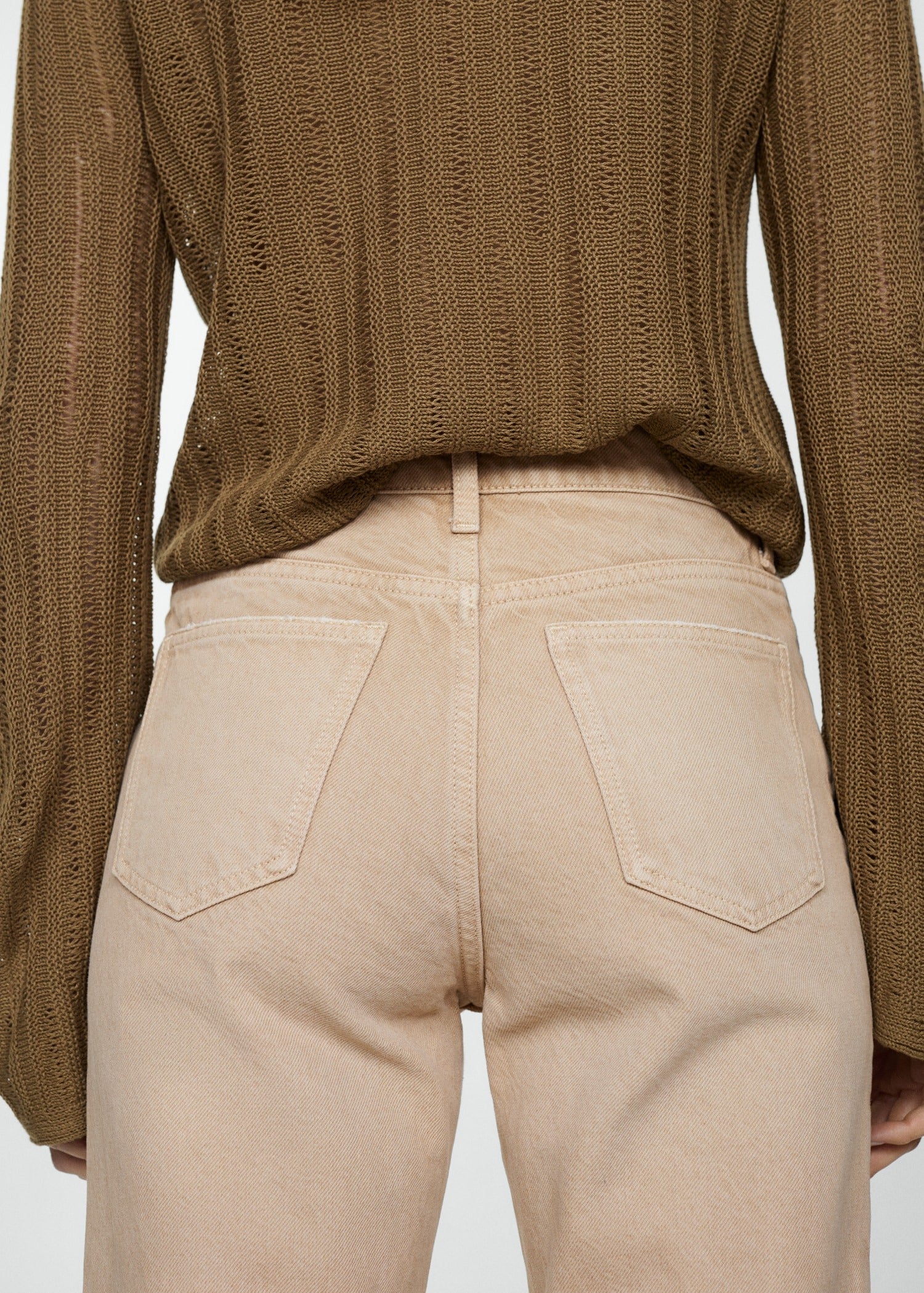Cowboy-style denim cotton fabric. Mom-fit. High waist. Belt loops. Five pockets. Zip and button fastening. Inside length 70 cm.