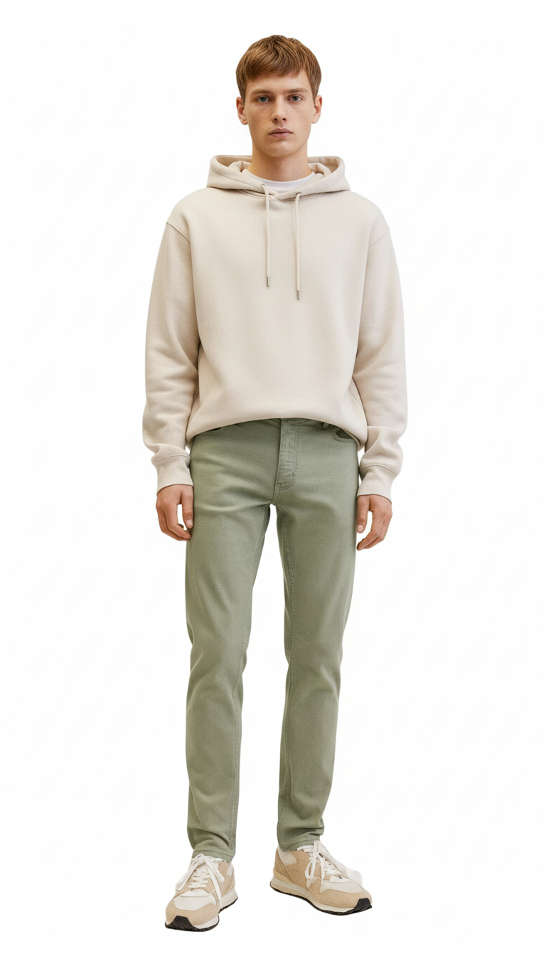 Slim fit. Denim design. Sustainable cotton blend fabric. Loops. Two side pockets. Coin pocket. Two patch pockets on the back. Zip and one button fastening.