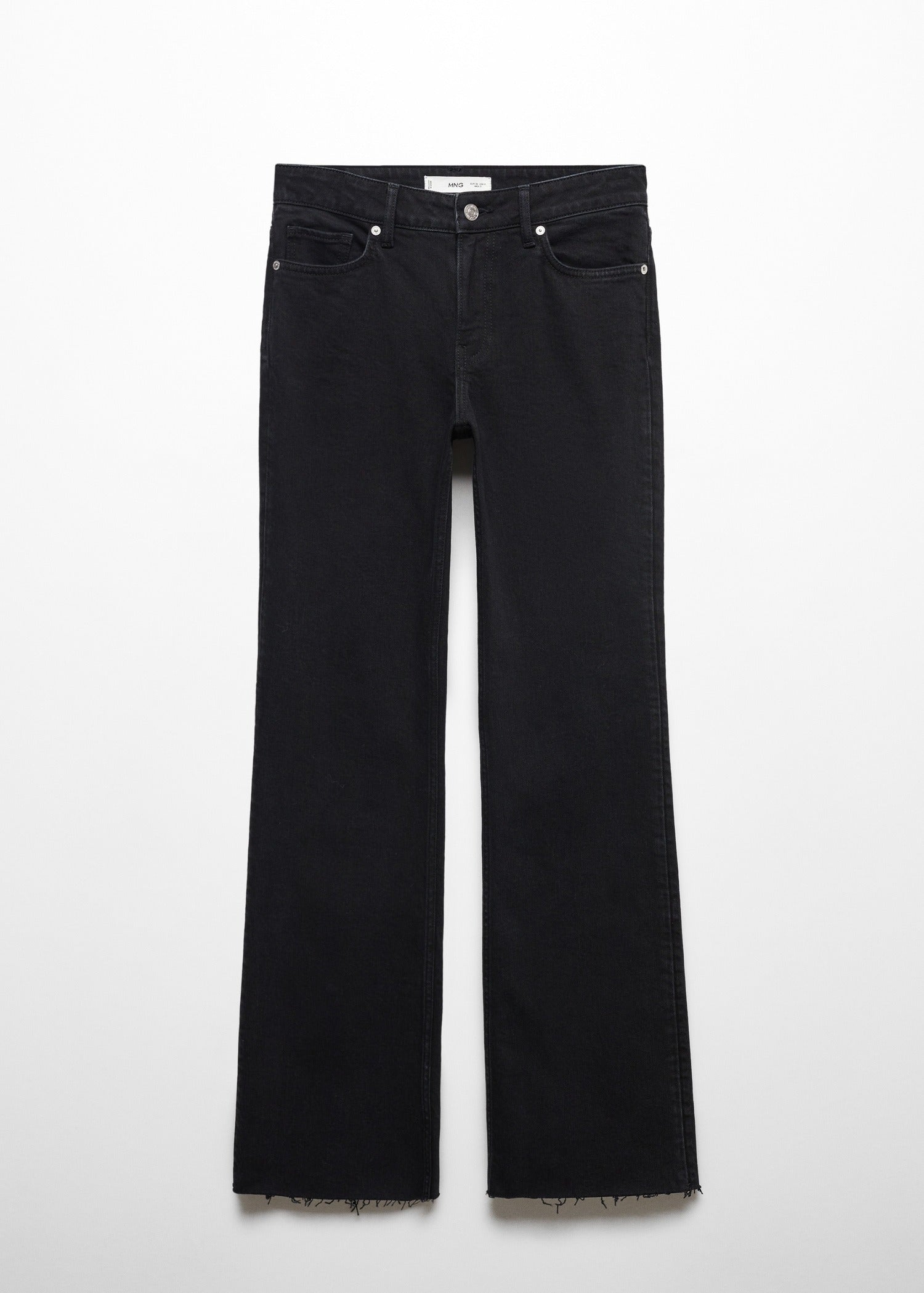 Denim style cotton fabric. Flared design. Medium waist. Loops. Five pockets. Zip and one button fastening. Frayed hem. Inseam 84 cm. Available Plus. Full length.
