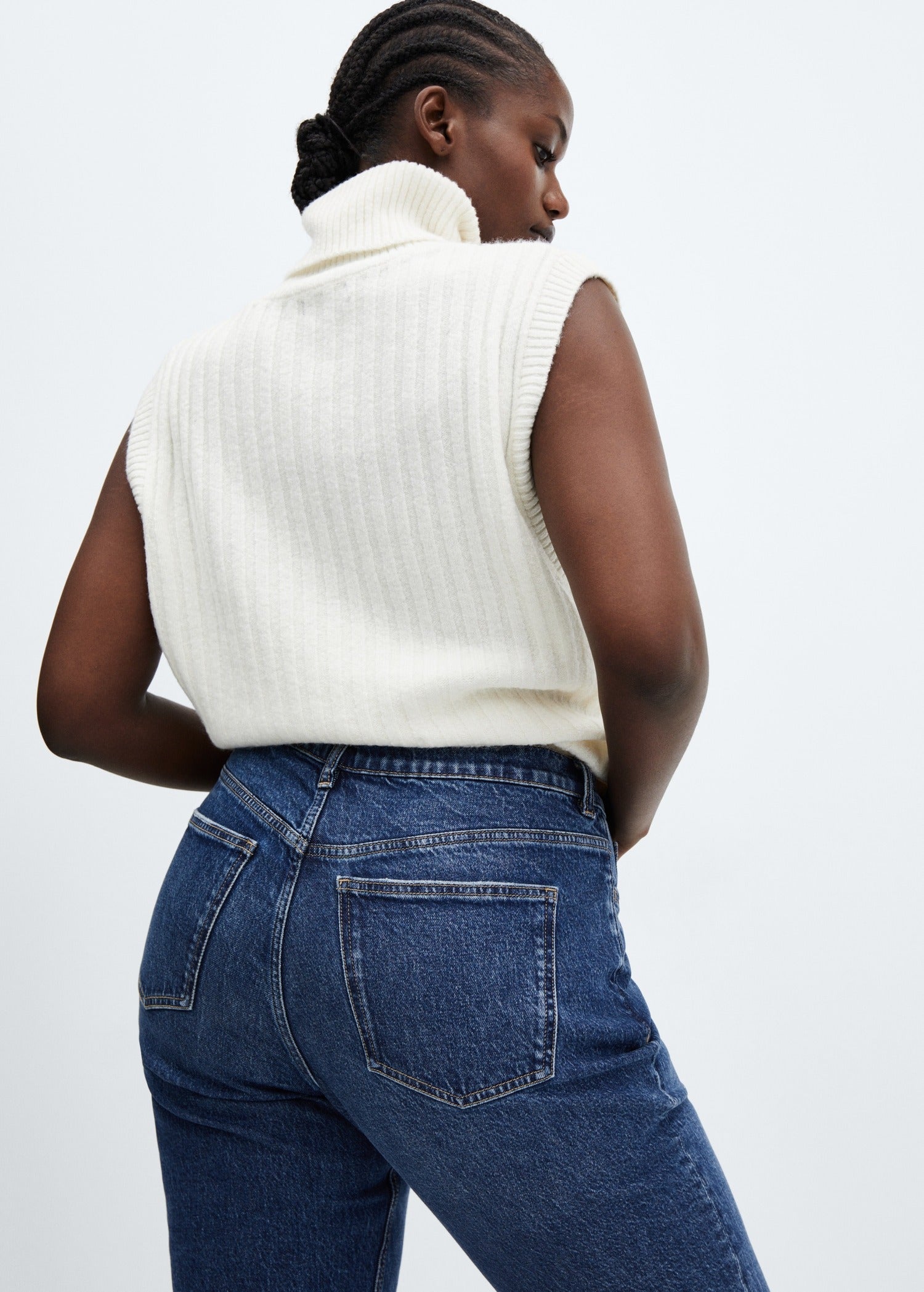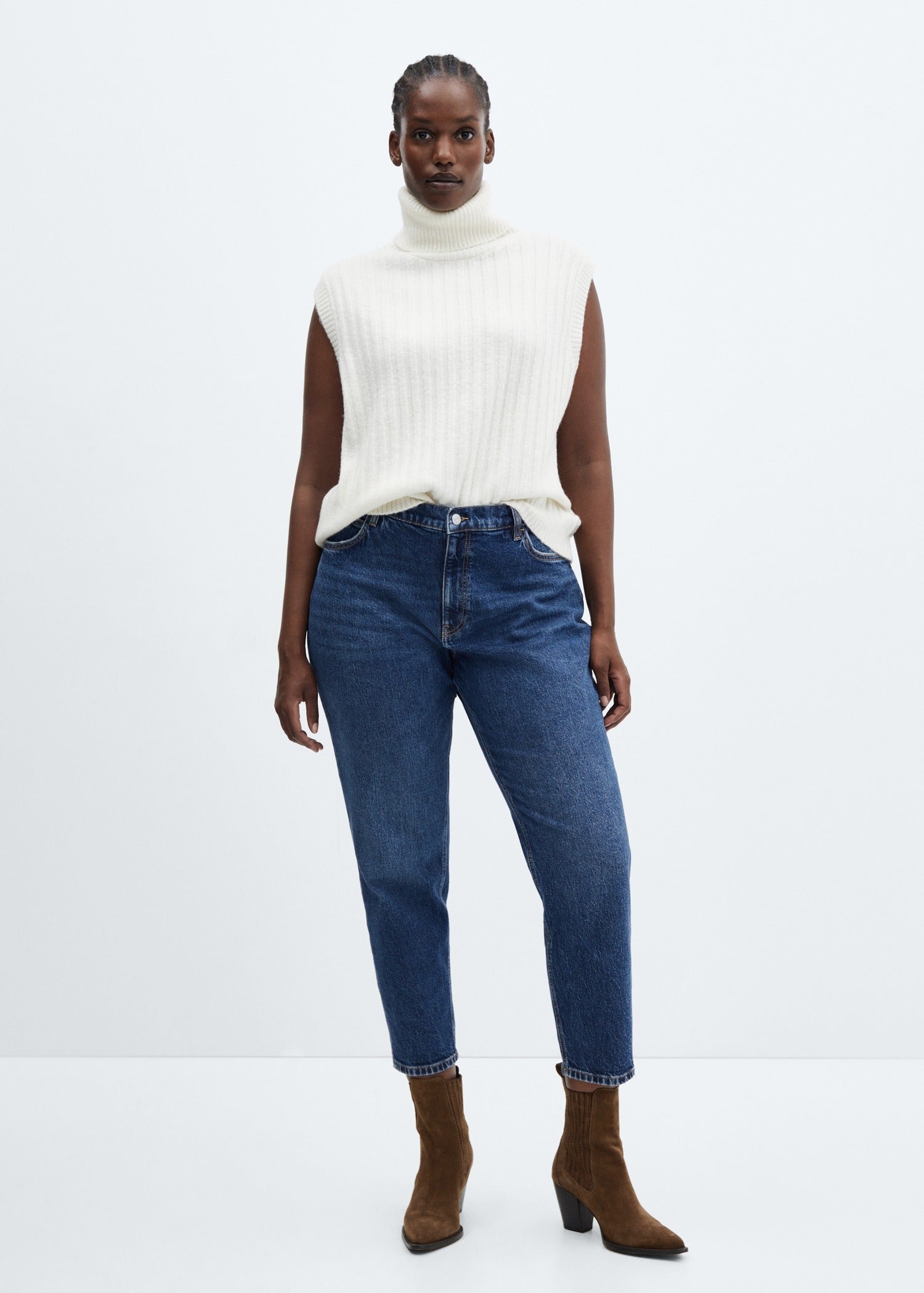 Denim style cotton fabric. Elastic. Mom-fit. High waist. Loops. Five pockets. Zip and one button fastening. Inseam 70 cm. Available Plus.