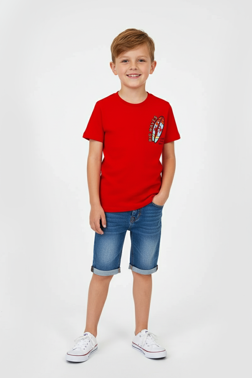 Bring the beach vibes to your kid’s wardrobe with this bright red “Big Waves” surf graphic t-shirt. Featuring a bold surfboard design with palm trees, sun, and “Surfer’s Paradise Hawaii” text, this tee is perfect for summer outings, vacations, or casual everyday wear. Made from soft and breathable cotton, it keeps your child comfortable all day long.