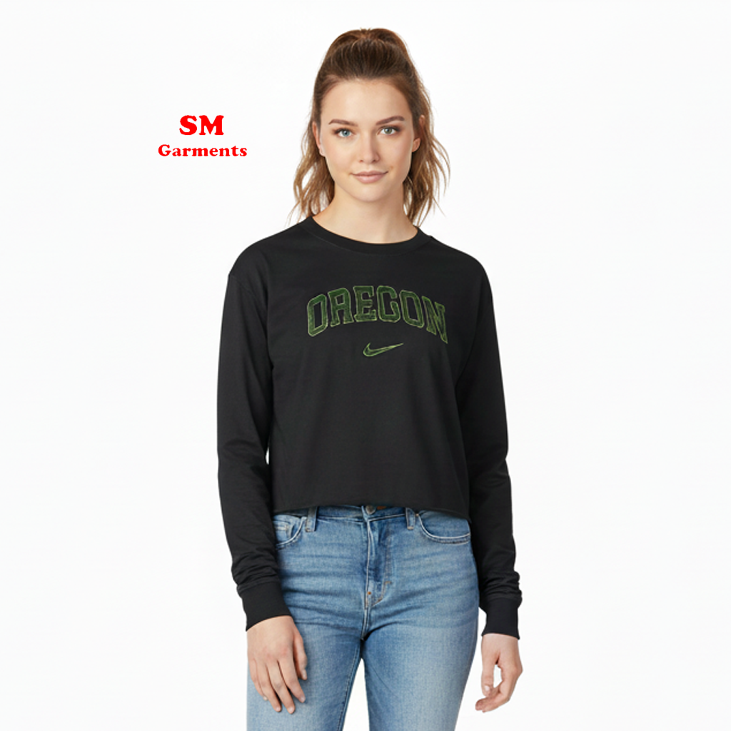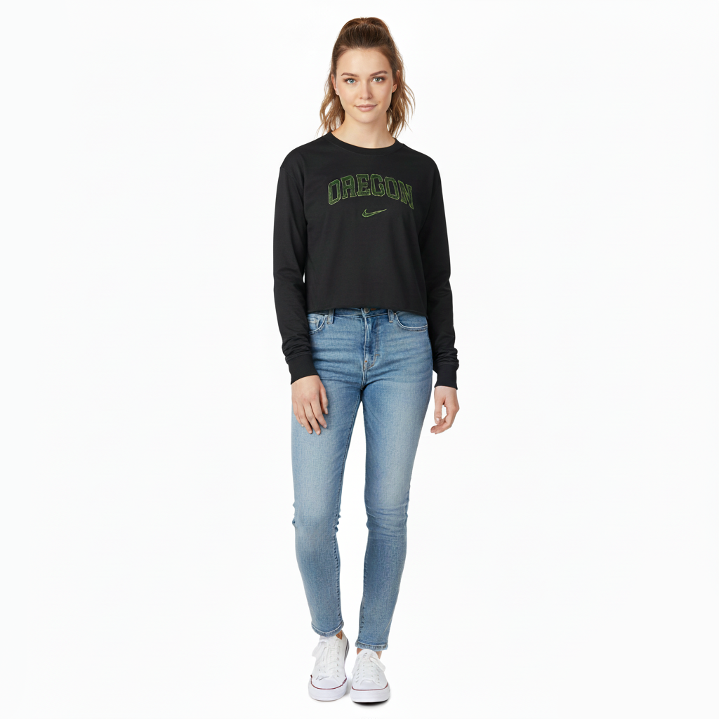 Represent your team in the cropped Oregon T-Shirt. Soft knit fabric in a roomy silhouette drapes you in effortless comfort while Ducks details let everyone know whose side you're on. Product Details: Ribbed cuffs. 100% cotton. Loose fit for a roomy feel. Machine wash. Imported. Style: DV8723; Color: Black; Size: M; Gender: Female; Age Group: Adult | Nike College (Oregon) Women's Cropped Long-Sleeve T-Shirt in Black, Size: Medium