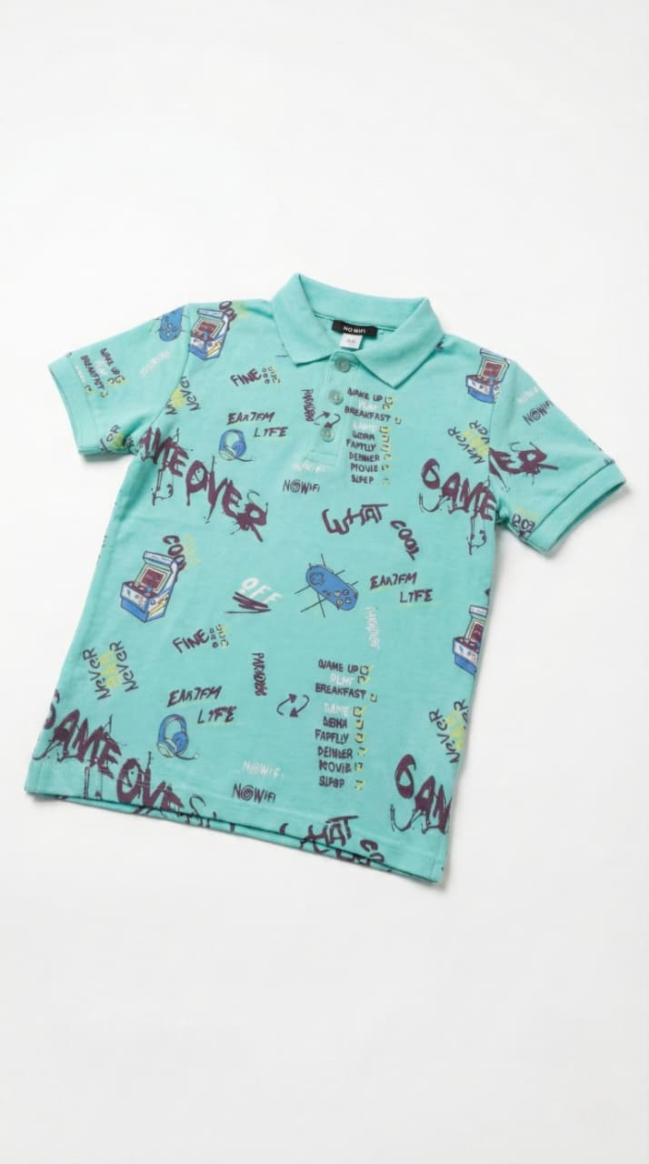 Elevate your young one's casual style with our vibrant Aqua Blue Graphic Print Polo Shirt. Crafted from soft, breathable fabric, this short-sleeve polo features an eye-catching all-over graphic design with playful text and illustrations, including gaming-inspired elements and upbeat phrases. The classic polo collar with a two-button placket ensures a comfortable fit and a smart-casual look, perfect for everyday wear, school, or weekend adventures. Its durable construction and fade-resistant print make it a practical and stylish addition to any boy's wardrobe. Pair it with jeans, shorts, or chinos for an effortlessly cool ensemble.