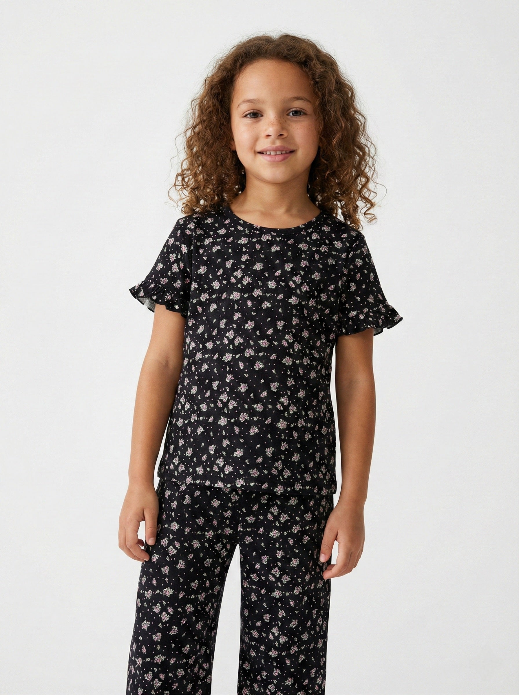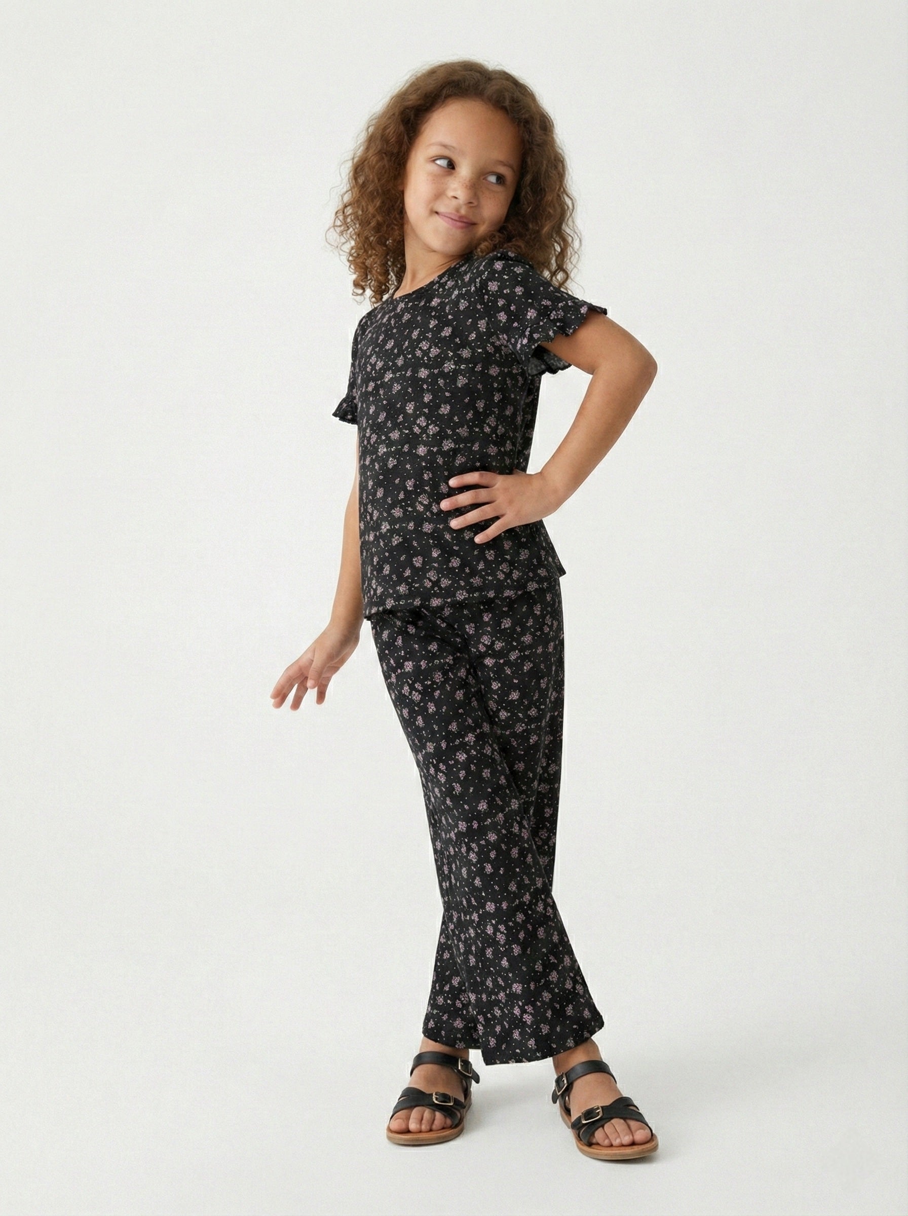 Introduce a touch of charming comfort to her wardrobe with this adorable Girls' Floral Ruffle-Sleeve Top & Wide-Leg Pant Set. Designed for effortless style and all-day wear, this two-piece outfit features a soft, breathable fabric adorned with a delicate all-over floral print.