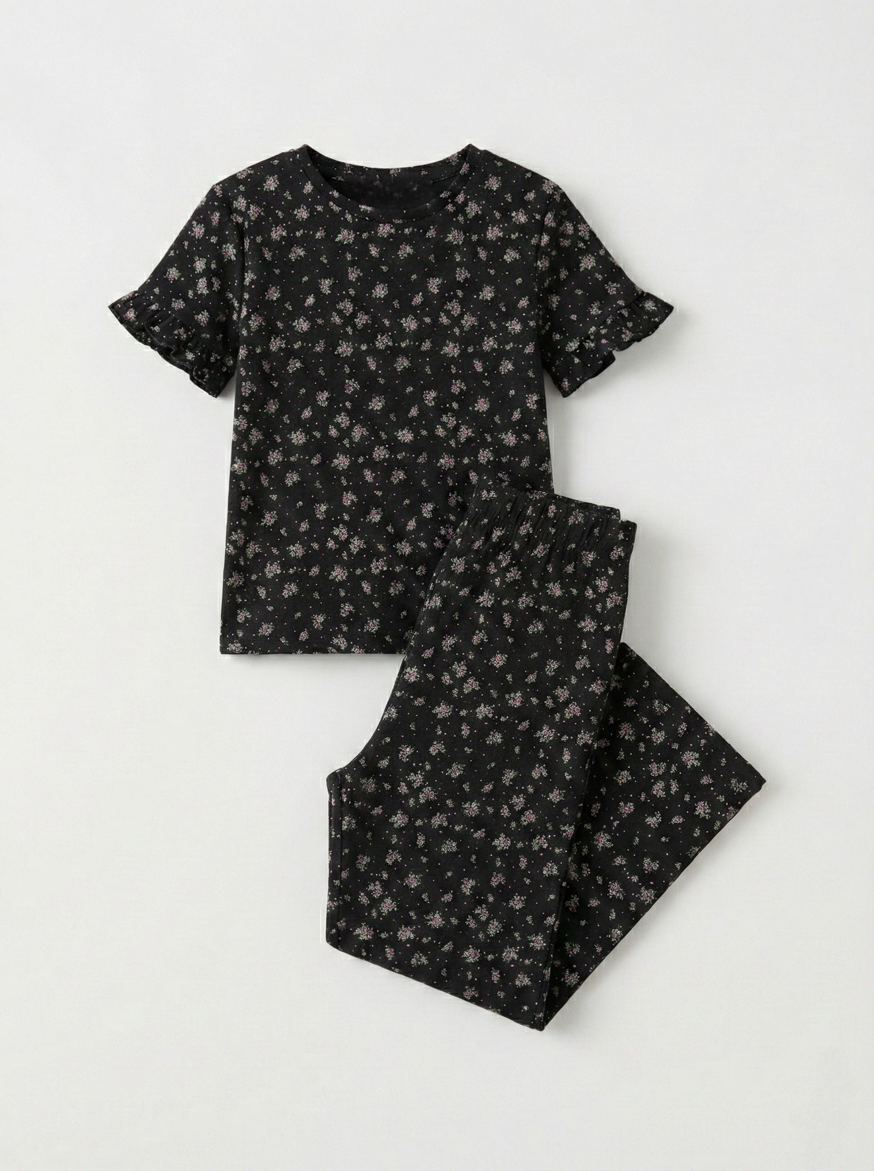 Two-Piece Set: Includes one floral ruffle-sleeve top and one pair of matching wide-leg pants.