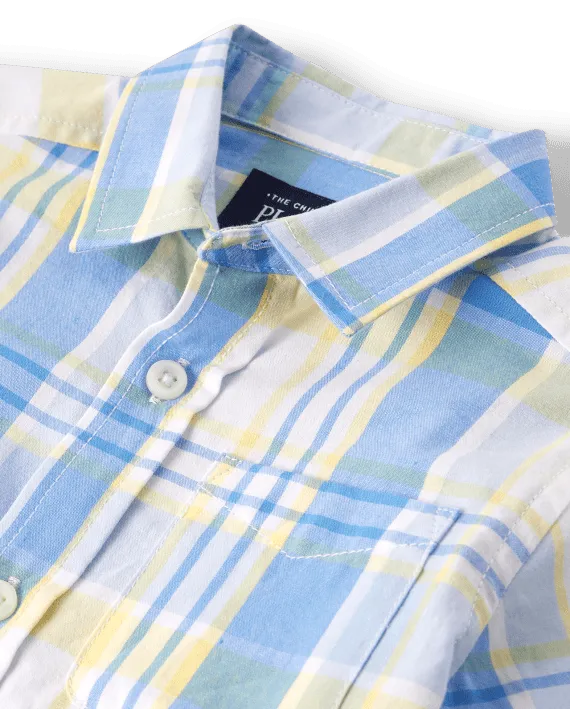 PLACE Boys Plaid Poplin Shirt Product Description 100% cotton poplin Button front Allover plaid Pointed collar Long...