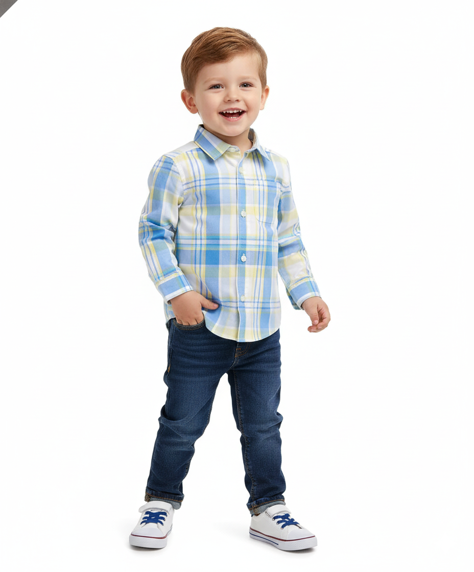 PLACE Boys Plaid Poplin Shirt Product Description 100% cotton poplin Button front Allover plaid Pointed collar Long...