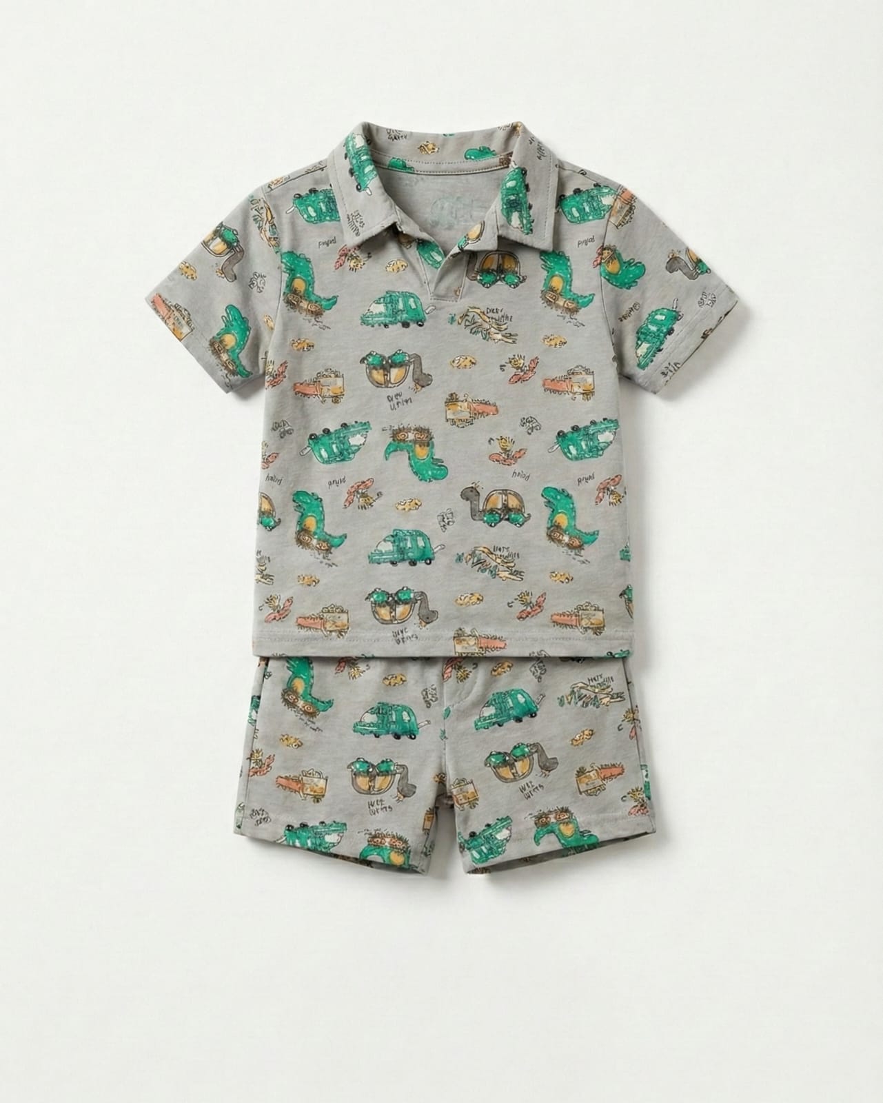 The grey short-sleeve polo shirt features a vibrant and playful all-over print of friendly dinosaurs driving various vehicles, adding a touch of whimsical charm. Designed with a classic polo collar and a comfortable fit, it ensures ease of movement for active toddlers. The coordinating shorts complete the look with the same fun print, offering an elastic waistband for a snug yet gentle fit.