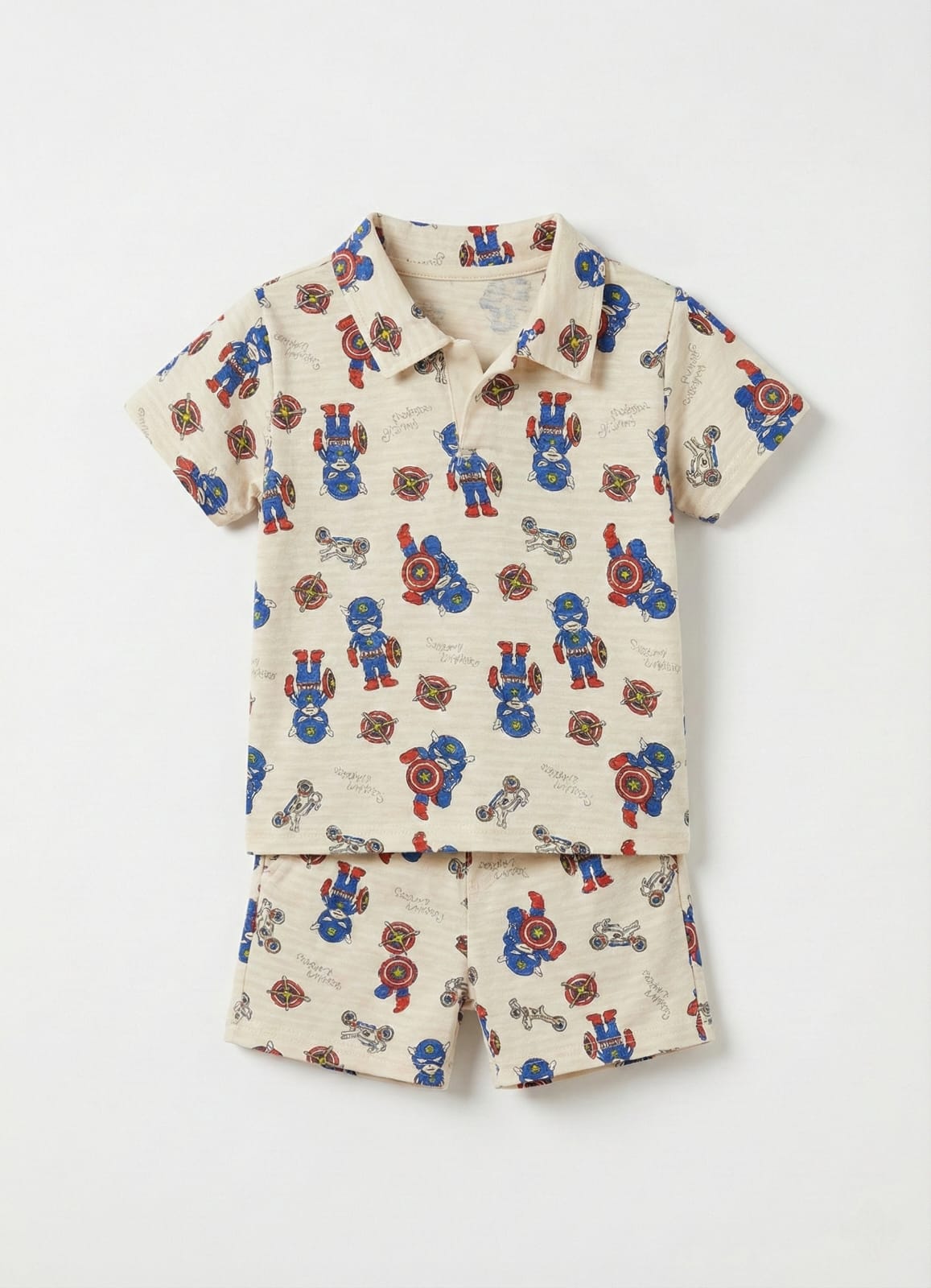 Let your little one's imagination soar with this adorable and comfortable toddler boys' superhero print polo shirt and shorts set. Crafted from soft, breathable fabric, this two-piece outfit features a playful all-over pattern of classic superhero motifs in vibrant red and blue hues on a stylish cream background.