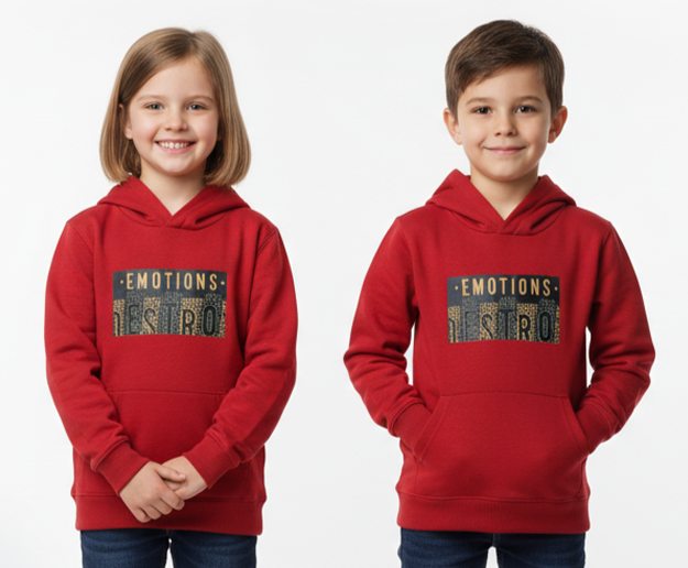 Add a pop of color and comfort to your child’s wardrobe with this Red Printed Hoodie. Designed for both boys and girls, this hoodie blends style with everyday practicality. The bold “Emotions” graphic print on the front gives it a trendy look, making it a favorite for school, casual outings, or playtime.