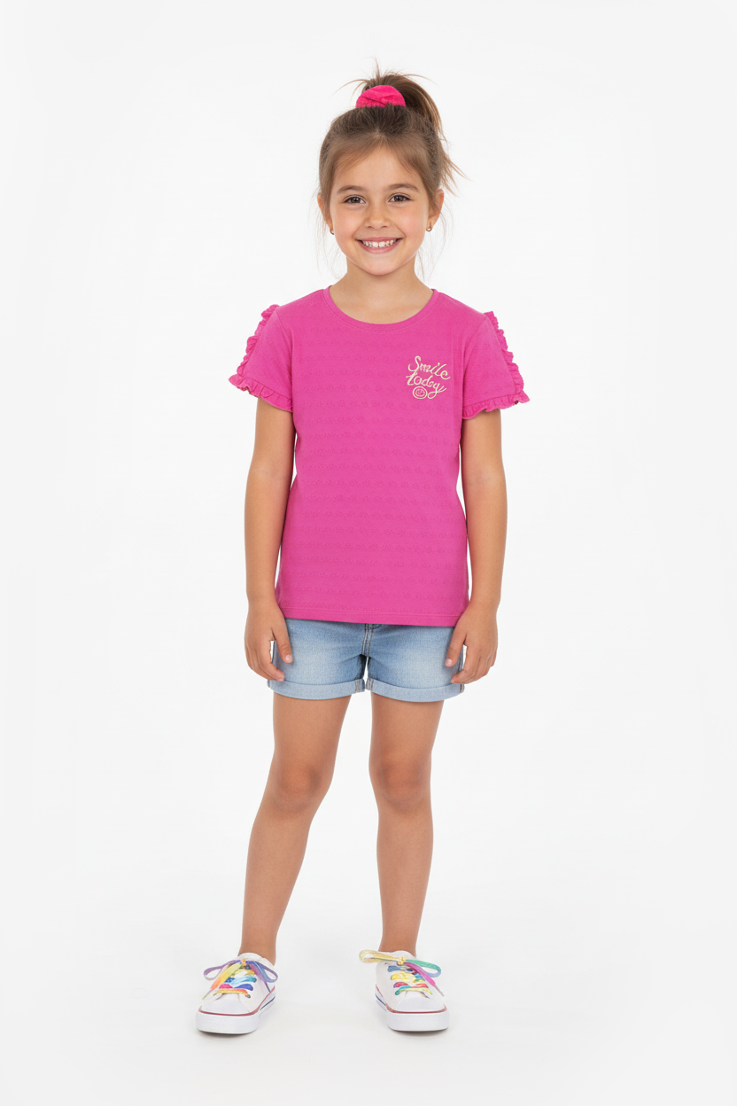 Tops in soft cotton jersey. Smile today embroidery on the chest Round neckline, ruffle over shoulders, and Short sleeves.