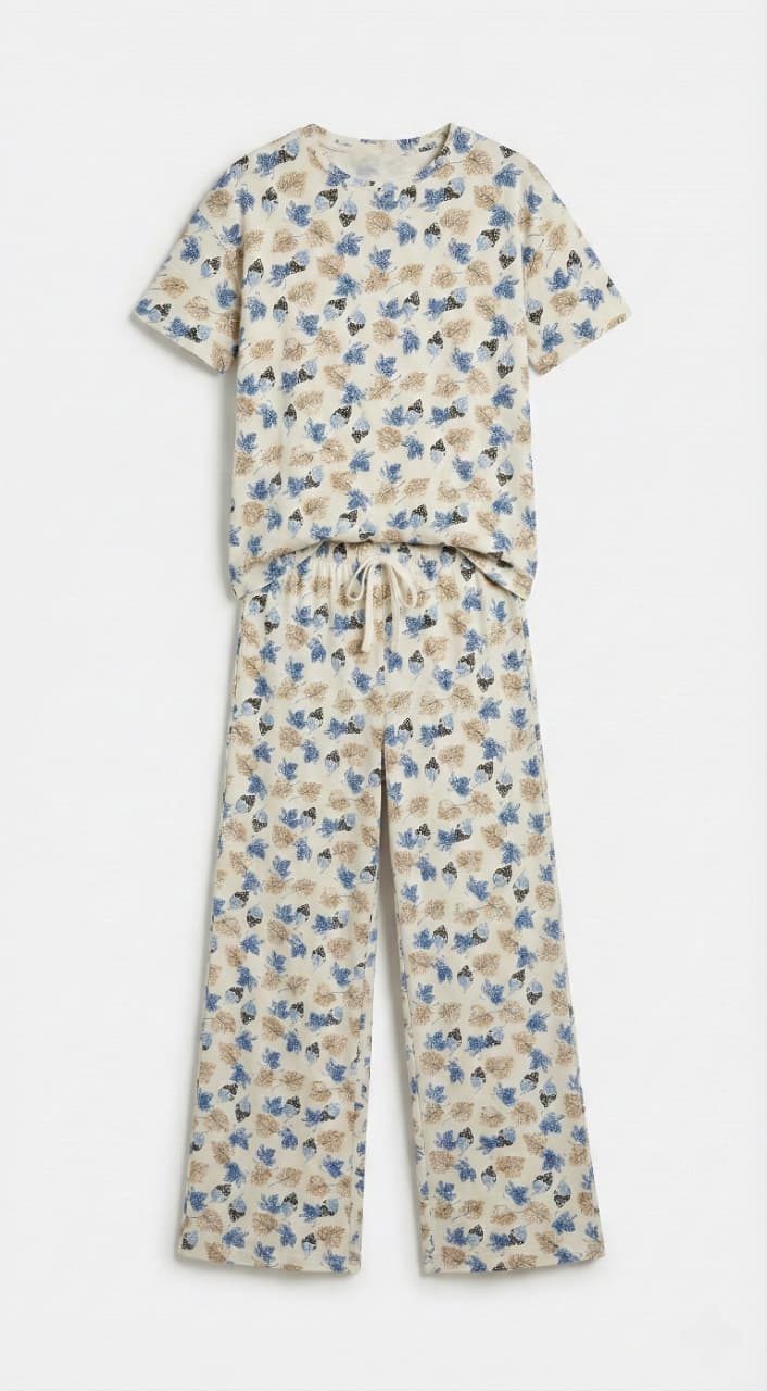 Elevate your casual wardrobe with this stylish and comfortable women's lounge set. Crafted from a soft, breathable fabric, this two-piece ensemble features a relaxed-fit t-shirt and coordinating wide-leg pants, both adorned with a contemporary abstract print in muted blue and earthy tones.