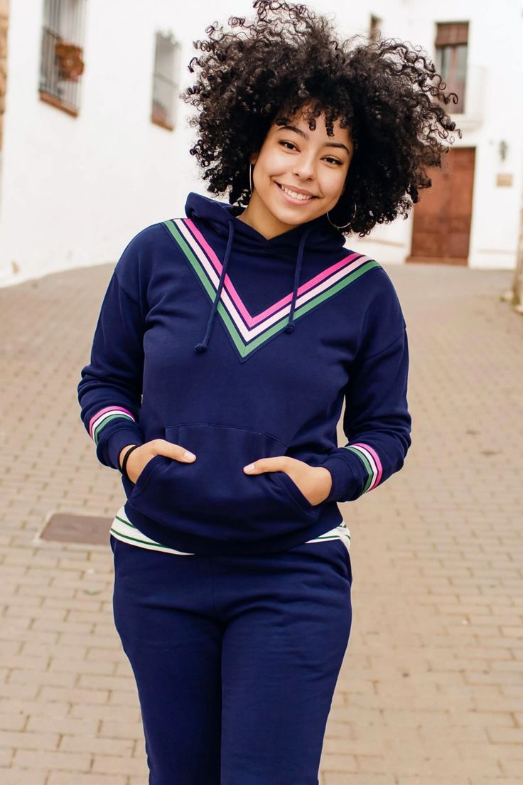 Cosy and comfy, the Jesse retro hoodie by Sugarhill Brighton is perfect for those chilly spring mornings or cooler summer evenings. Flatteringly shaped, with a ribbed waist and retro drawstring hood, the Jesse is navy with 3 colour chevron stripes across the chest and shoulders, which are echoed at the cuffs. Retro sporty 70s style hoodie in 100% organic cotton.