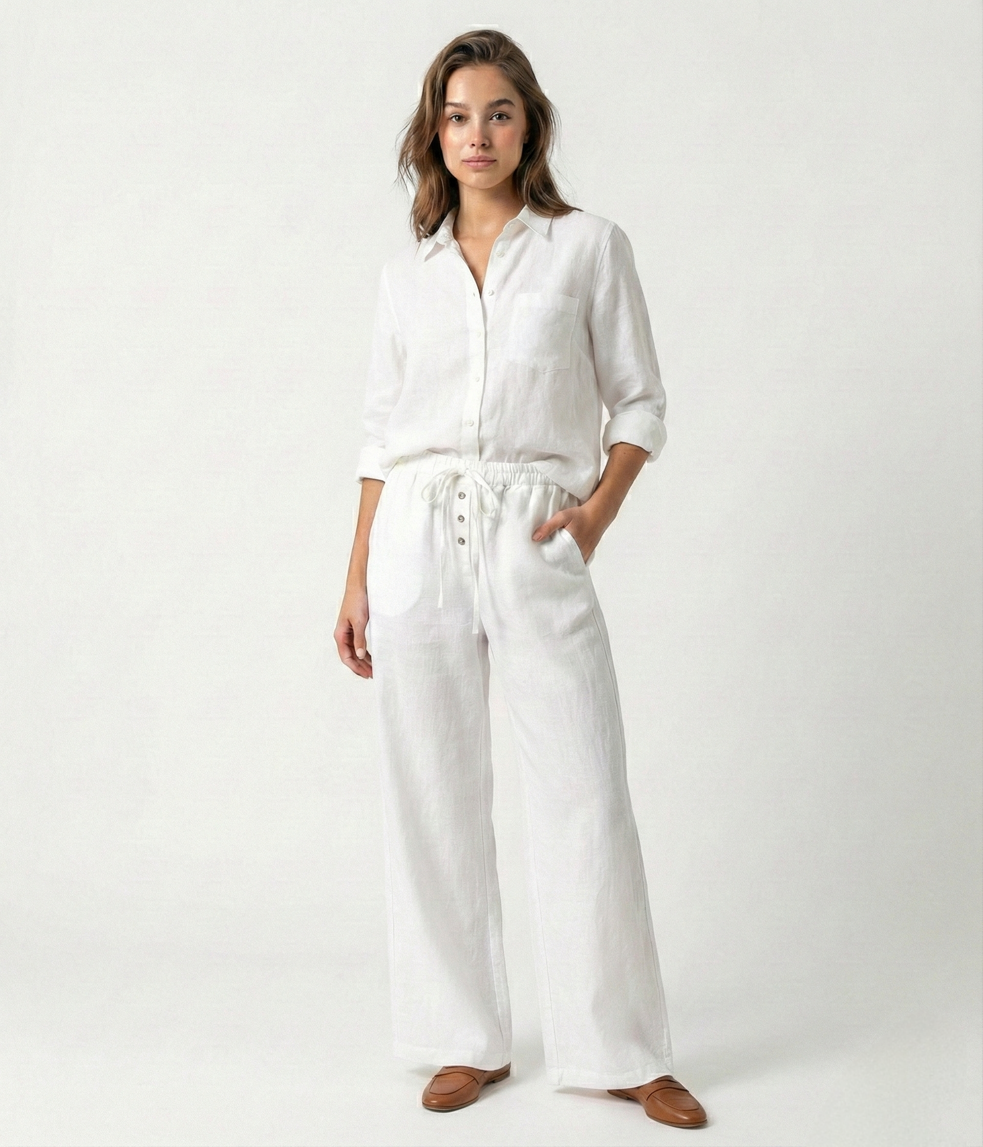 Step into effortless style and comfort with our Women's High-Waisted Wide-Leg Trousers. Crafted from a breathable and lightweight linen blend fabric, these trousers are perfect for warm weather and versatile enough for various occasions.