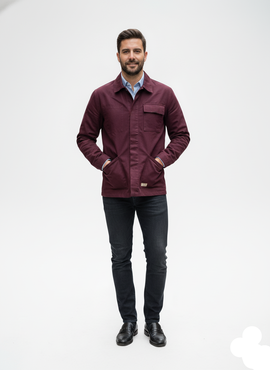 Master the art of smart-casual layering this season. This clean, workwear-inspired jacket in a deep maroon is the ideal piece for adding color and structure to your everyday wardrobe. The simple silhouette, clean lines, and updated button placement (just under the collar) give it a modern edge. Pair it with a button-down and black jeans for a look that's perfect for a weekend outing or a casual Friday.