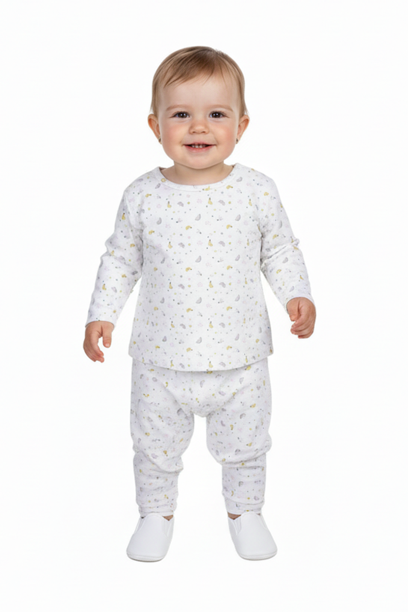 Keep your baby cozy and cute with our Soft White Printed Long Sleeve Top. Designed with a charming all-over print featuring tiny fruits, flowers, and playful shapes in soft pastel colors, this top is as sweet as it is practical. Made from soft, breathable cotton, it’s gentle on your baby’s delicate skin and perfect for layering in cooler weather.