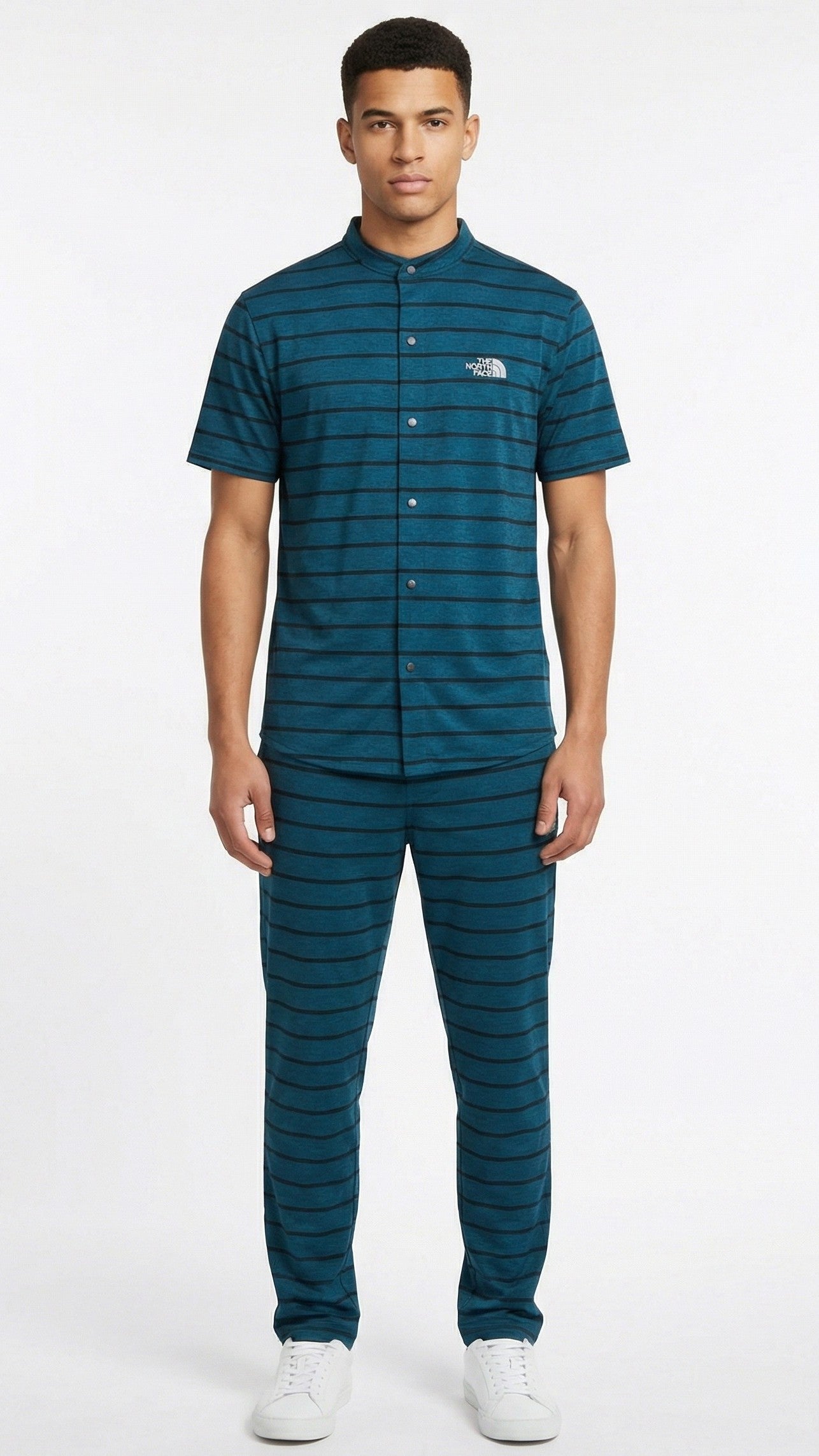 The sleek horizontal stripe design adds a sporty yet refined look, while the lightweight and breathable construction ensures all-day comfort. Featuring a button-front style with a minimal collar and the iconic THE NORTH FACE logo on the chest, this shirt delivers a perfect balance of functionality and brand appeal.