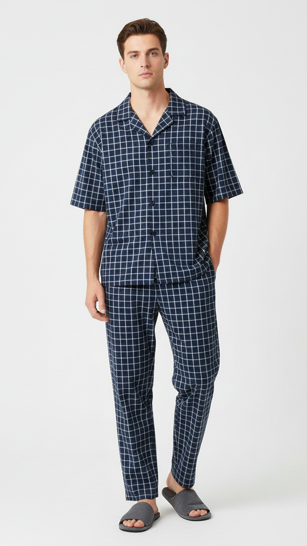 Comfort meets classic style with these men's navy and white checkered trouser. Featuring a timeless grid pattern, these soft and breathable pants are perfect for relaxing at home. They offer a comfortable fit, ideal for a good night's sleep or lounging around on a weekend morning.