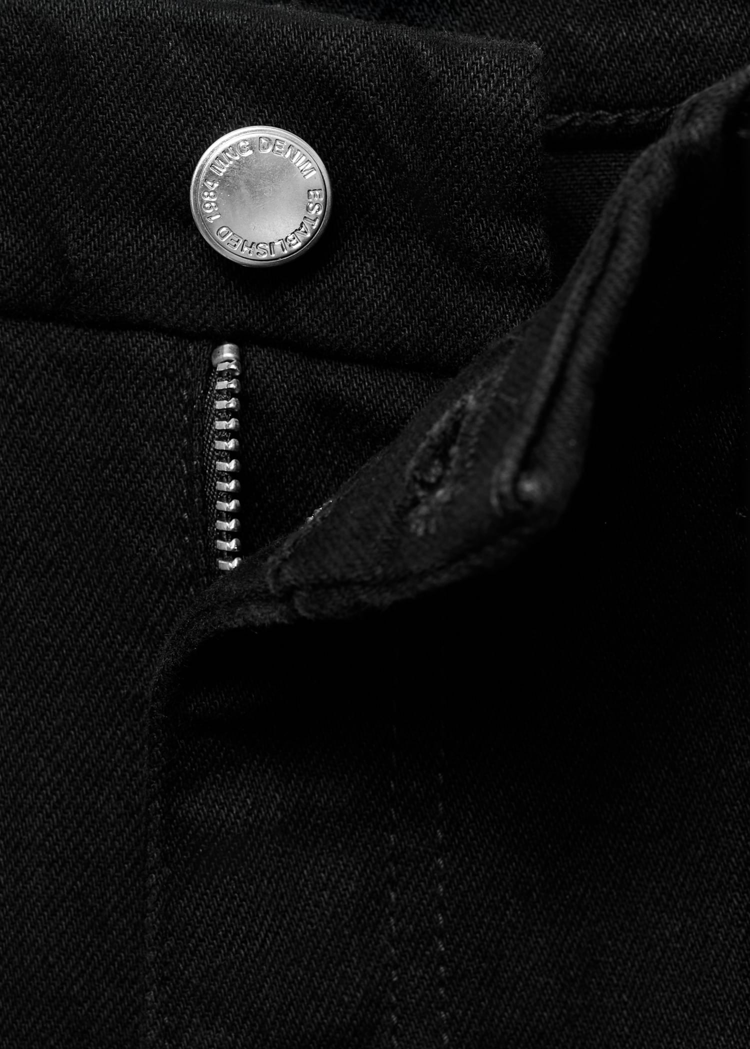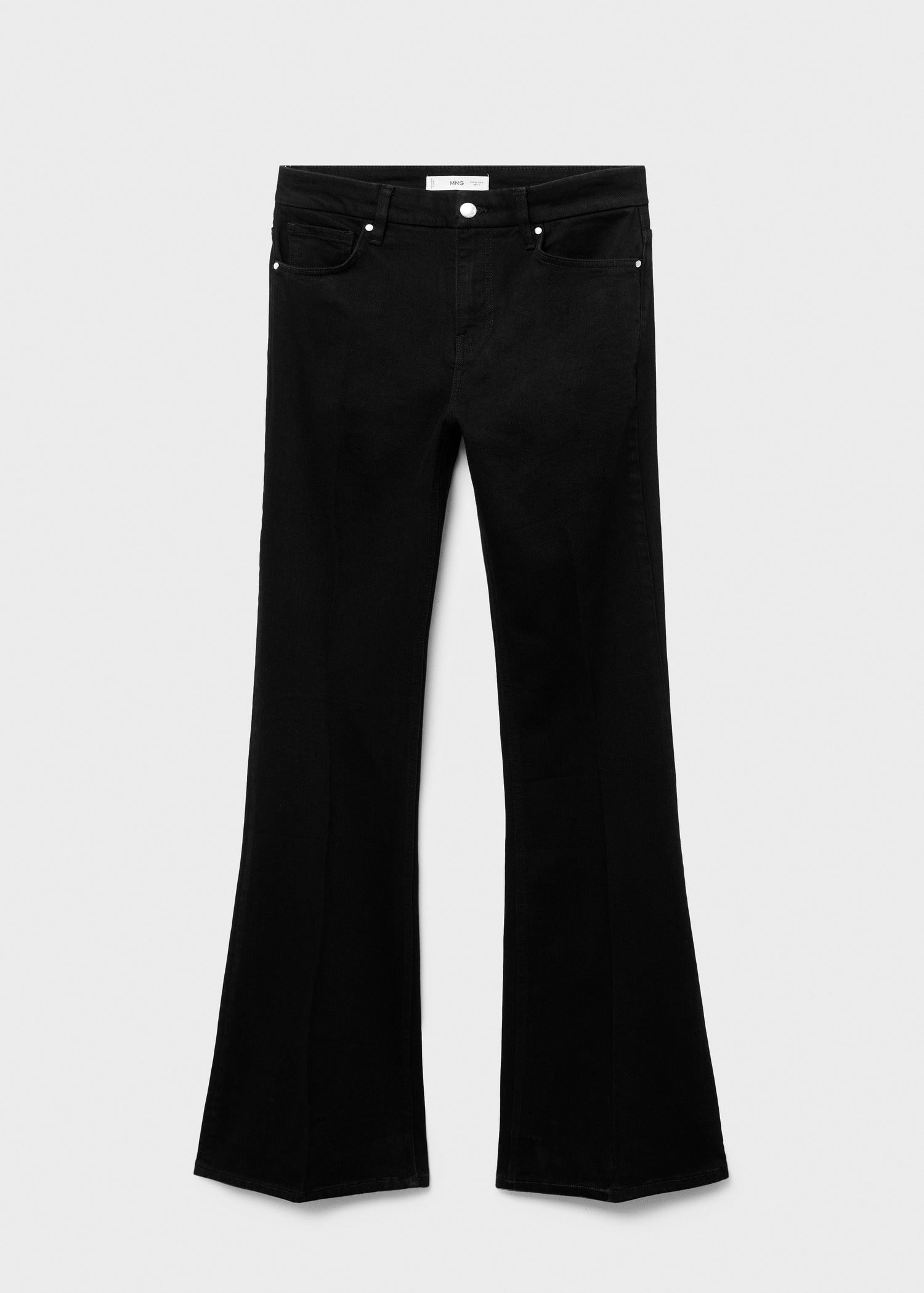 Denim-style cotton fabric. Long design. Flare design. High waist. Belt loops. Five pockets. Button and zip fastening. Interior length 87.5 cm. Comfort fabric with elasticity.